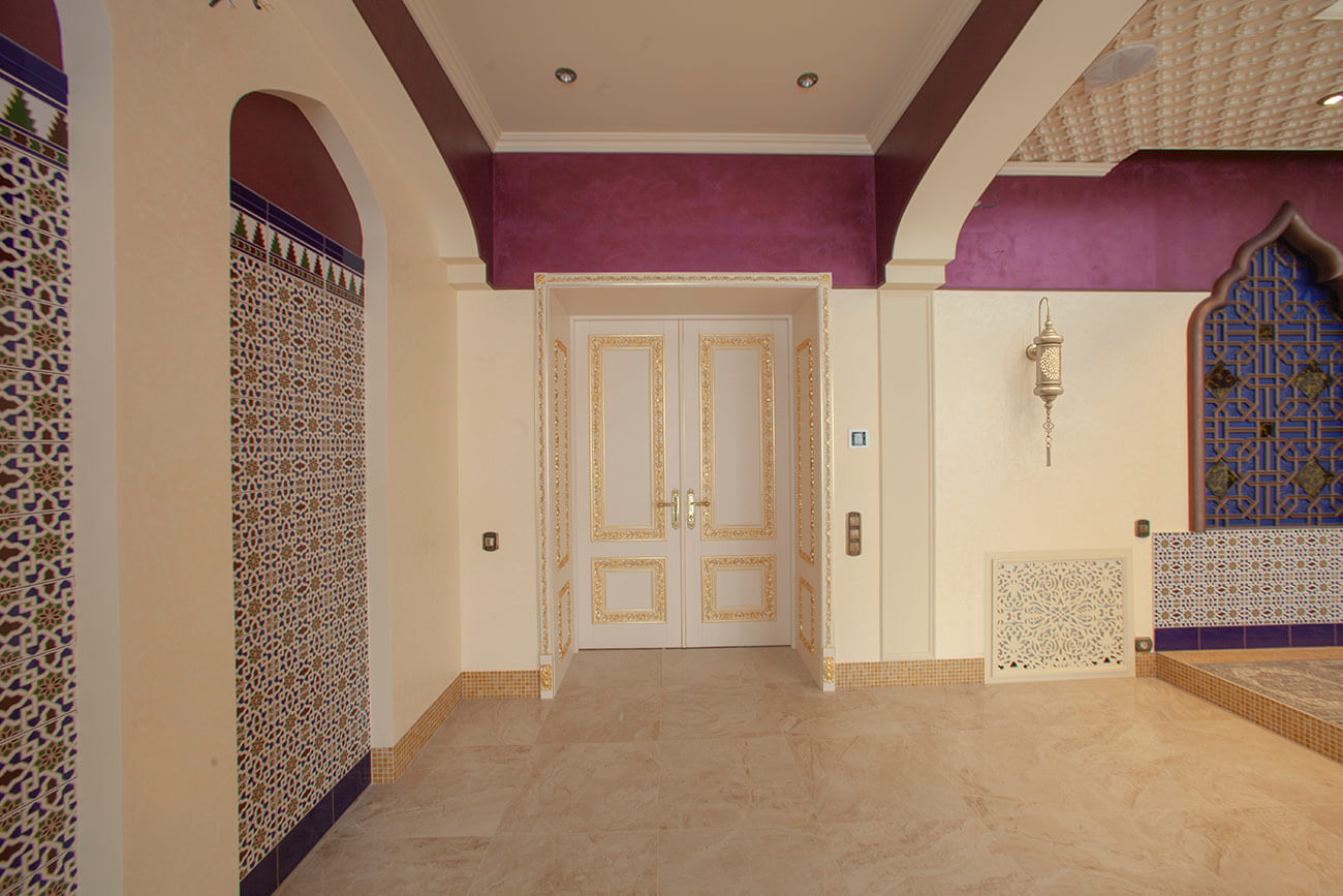 На полах керамогранит с узорами восточного ковра перекликается с керамогранитом под бежевый мрамор. В отделке потолков применены зеркальные панели с фацетированием, совмещенные по периметру с гипсовыми панелями с мелким восточным орнаментом (изготовлены специально на заказ по проекту дизайнера).