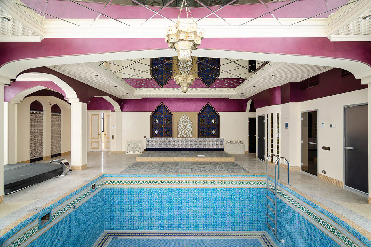 Зона отдыха украшена декоративными нишами, внутри которых располагаются гипсовые панели Artpole в восточном стиле с декоративными стеклами, между нишами — мозаичное панно ручной работы.