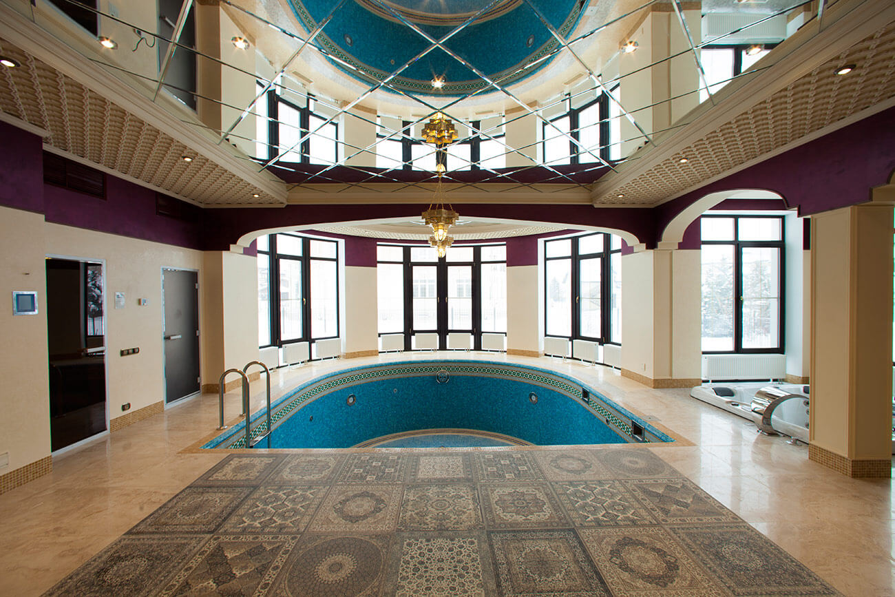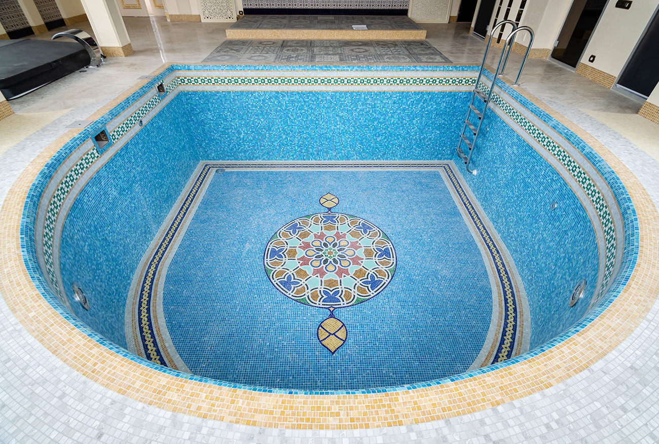 Дно чаши бассейна украшено мозаичным панно ручной работы, стены — декоративными бордюрами.