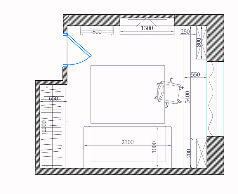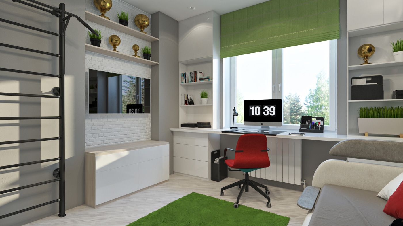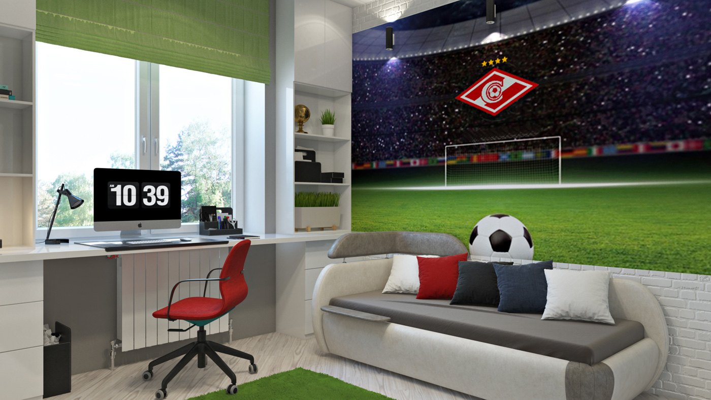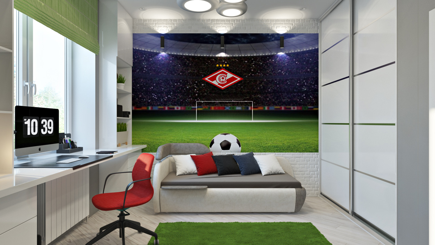 Концепцией данного решения спальни для ярого футбольного болельщика, который и сам профессионально занимается футболом, стало создание атмосферы футбольной арены. Большие панорамные обои, уводящие в перспективу футбольного поля, еще и расширяют пространство.