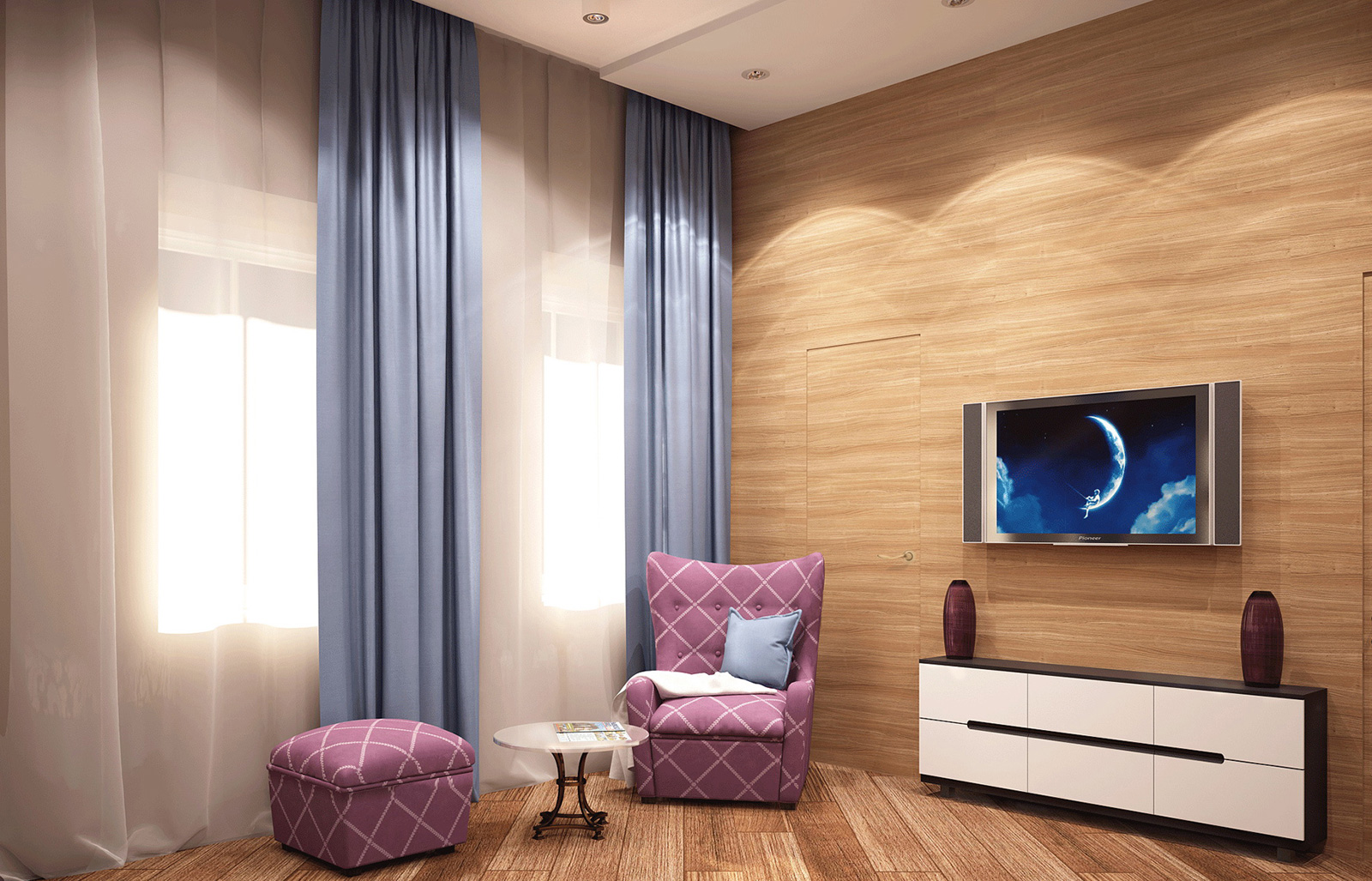 При разработке дизайн-проекта авторы ориентировались на цветовую палитру, которую хотели видеть заказчики. Микс из пастельных и природных тонов подчеркивают яркие акценты: фиолетовые вазы, кресло, пуфик и текстиль ягодных оттенков.