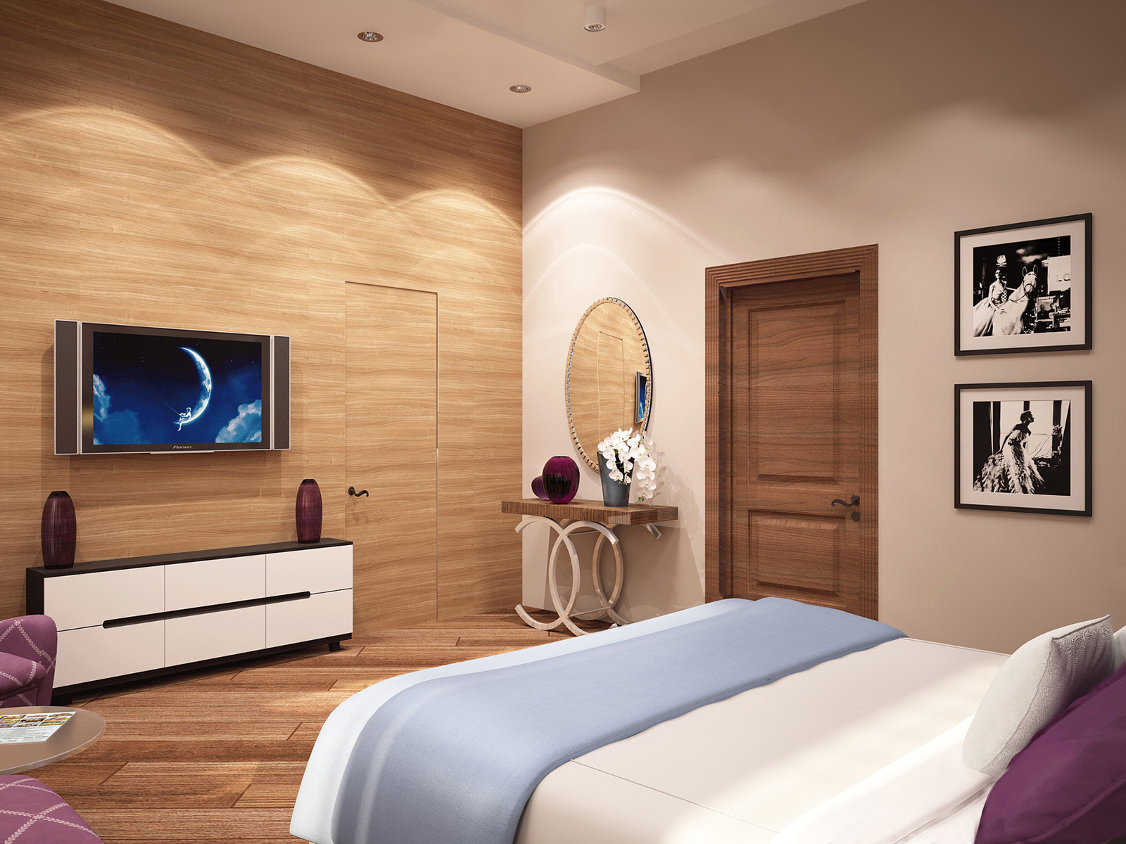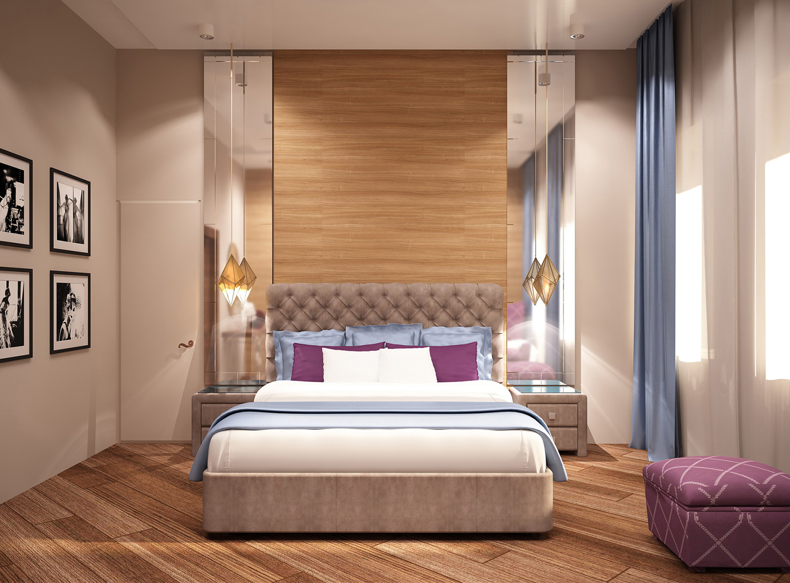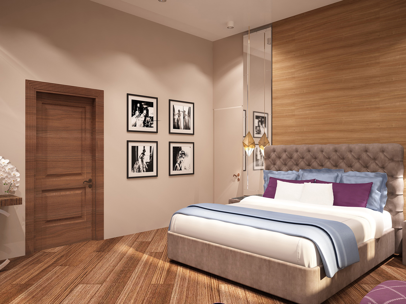 Для оформления стен использовалась немецкая краска Derufa Gluck H&H. На полу положили паркет. Две стены — напротив кровати и у изголовья — декорированы деревянными панелями. С обеих сторон от изголовья размещены зеркальные полотна. Двери в гардеробные потайные, не привлекающие к себе внимания.