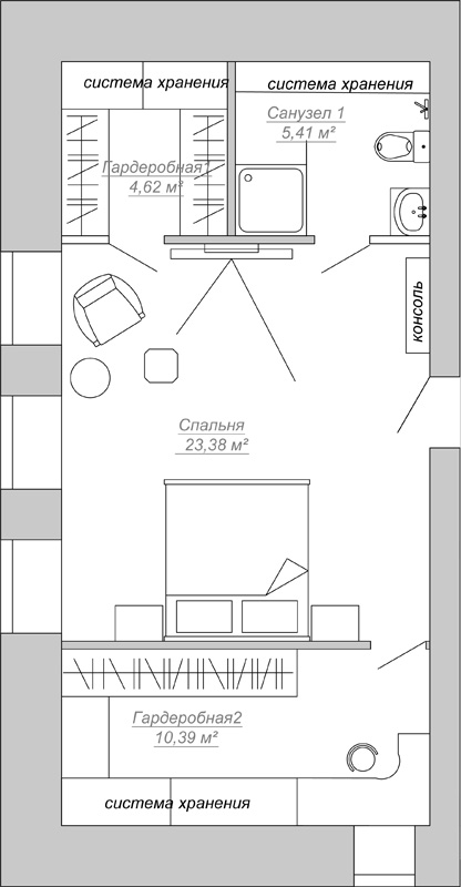 Заказчики — молодая семейная пара. Главной задачей было обустроить спальню на втором этаже коттеджа и выделить достаточно места для хранения вещей. Хозяева хотели получить легкий, уютный интерьер в пастельных, природных тонах, с цветовыми акцентами ягодных оттенков.