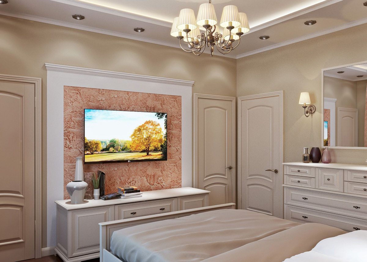 Дизайн-проект спальной комнаты разработан в загородном доме для супружеской пары с двумя детьми. Спальню решили сделать в консервативной современной классике.