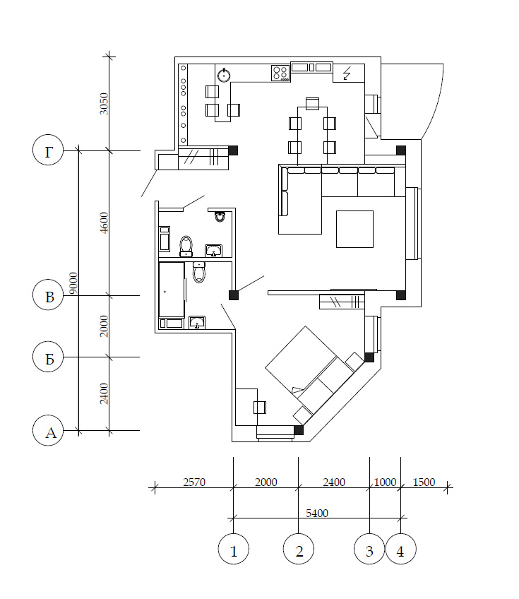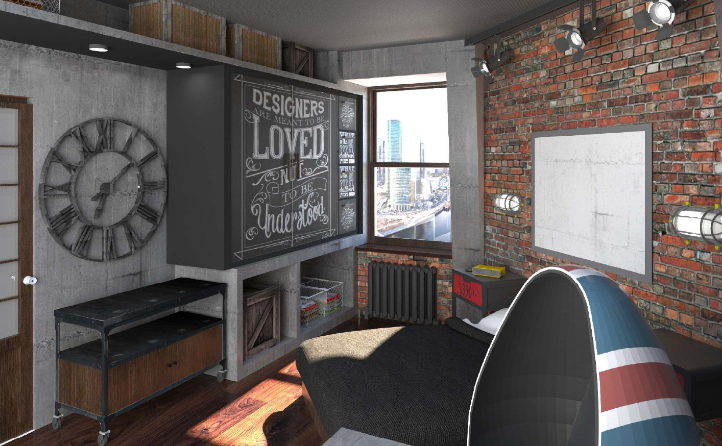 Спальня площадью 16 м² спроектирована для квартиры в стиле лофт. Несмотря на то, что комната отличается непрямоугольной конфигурацией, автору удалось получить интересный и в то же время эргономичный дизайн. Спальня имеет выходы в примыкающий к ней санузел и гостиную. Обе двери равноудалены от двуспальной кровати, что облегчает движение по комнате и проход в смежные помещения.