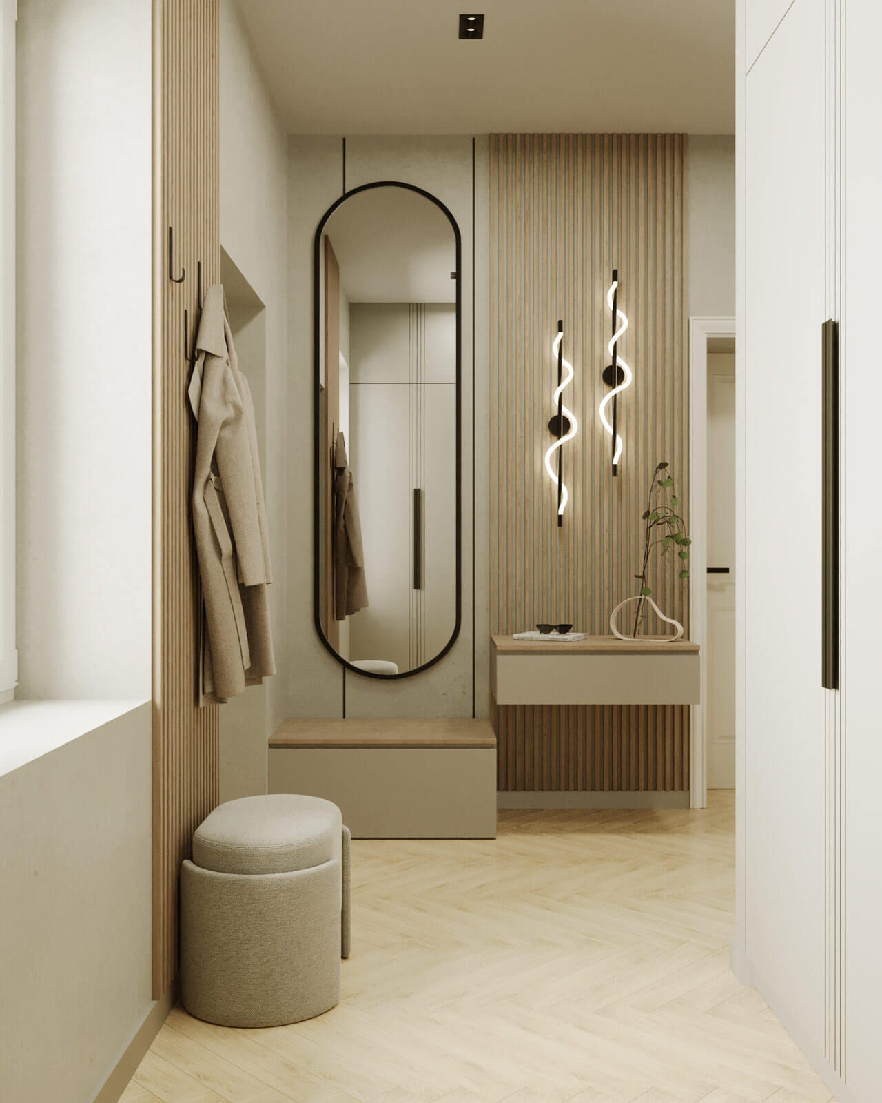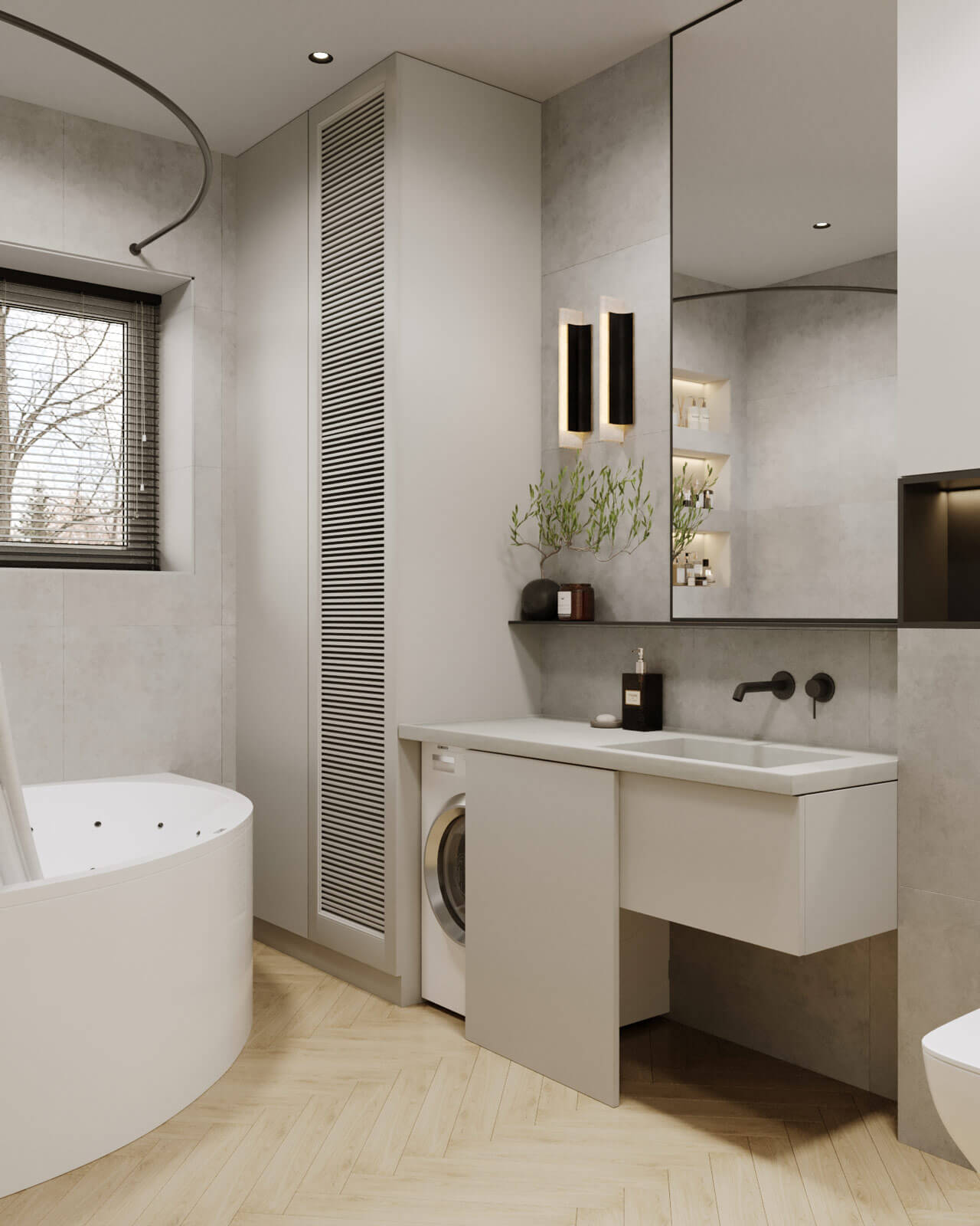 На стенах использована светло-серая штукатурка. На полу – плитка под фактуру дерева. Также использована фактура мрамора, которая аутентично подчеркивает внутреннюю гармонию человека и стремление соединения с природой.