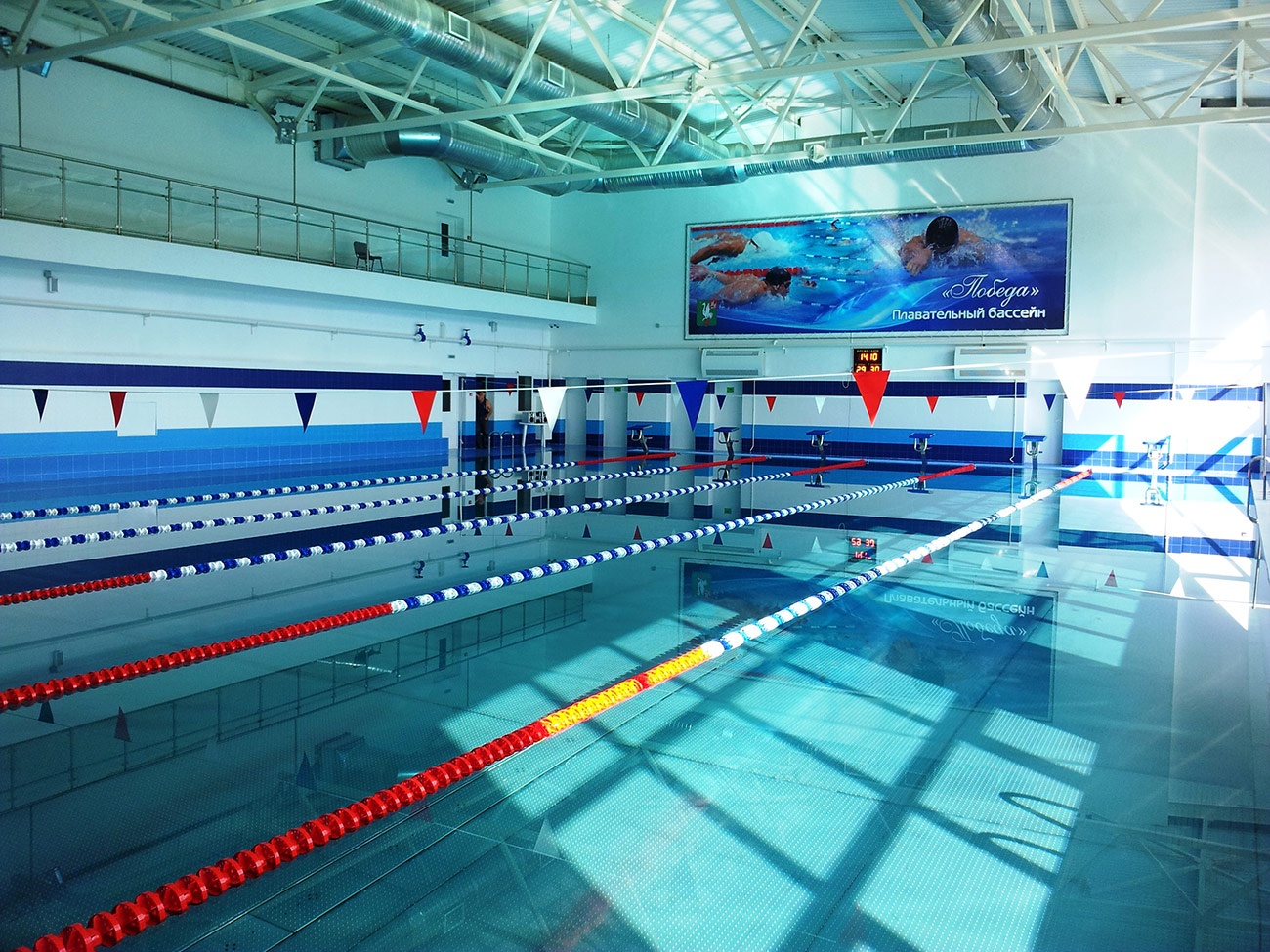 Бассейн переливного типа размером 25 х 16 м предназначен для спортивного учебно-тренировочного и оздоровительного плавания. Он выполнен из нержавеющей стали. Все закладные элементы, лестницы, поручни, прожектора также изготовлены из высококачественной нержавеющей стали.
