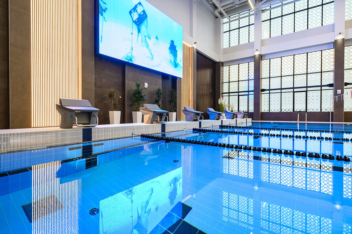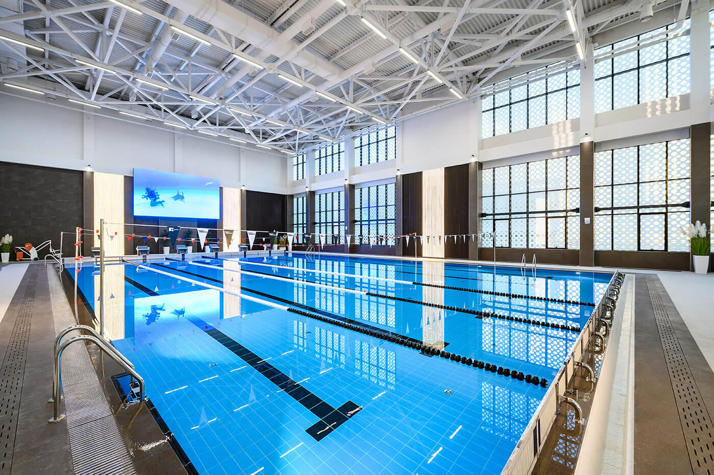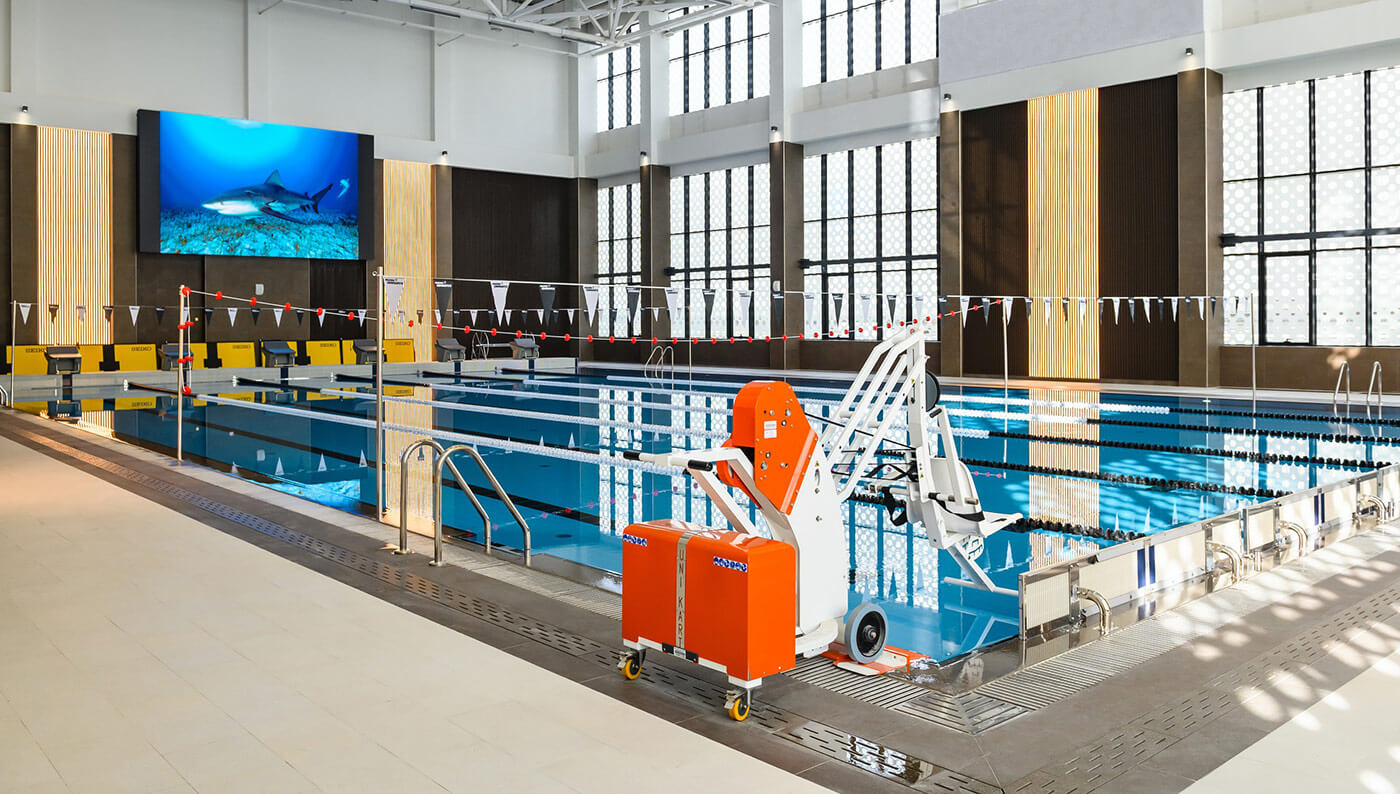 Бассейн 25*16 м, оснащенный всем необходимым спортивным оборудованием: стартовые тумбы с датчиком фальстарта установлены на помосте, что является залогом безопасности, поворотные панели находятся с противоположной стороны от помоста. Для проведения внутренних соревнований клуба в проект была внедрена система хронометража Seiko. На влагозащищенный мультимедийный светодиодный экран выводятся не только результаты соревнований, но и любые видеофайлы.