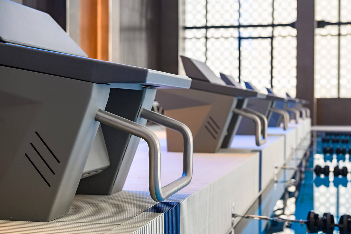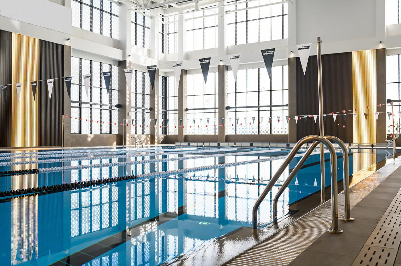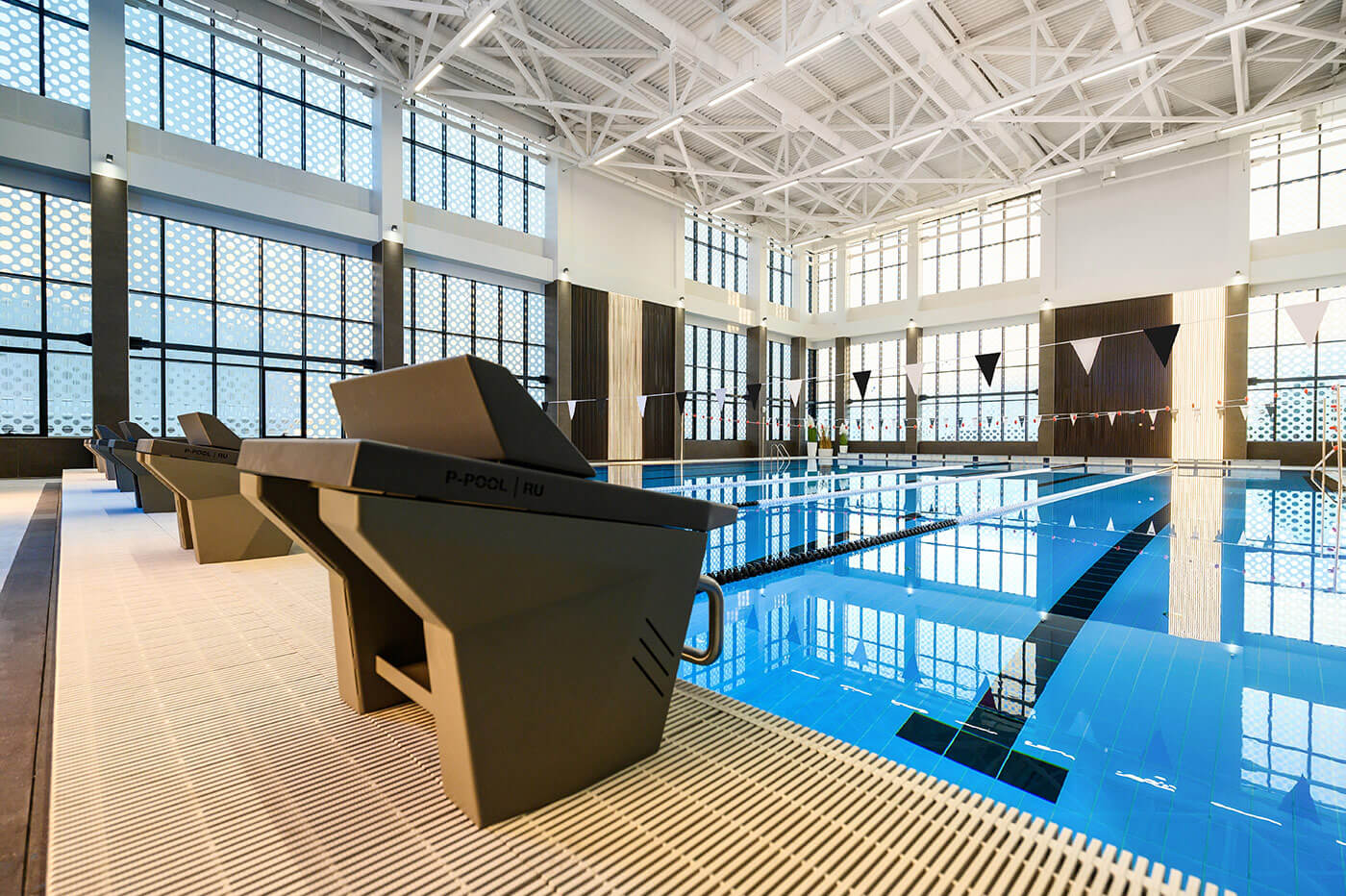 Бассейн 25*16 м, оснащенный всем необходимым спортивным оборудованием: стартовые тумбы с датчиком фальстарта установлены на помосте, что является залогом безопасности, поворотные панели находятся с противоположной стороны от помоста. Для проведения внутренних соревнований клуба в проект была внедрена система хронометража Seiko. На влагозащищенный мультимедийный светодиодный экран выводятся не только результаты соревнований, но и любые видеофайлы.