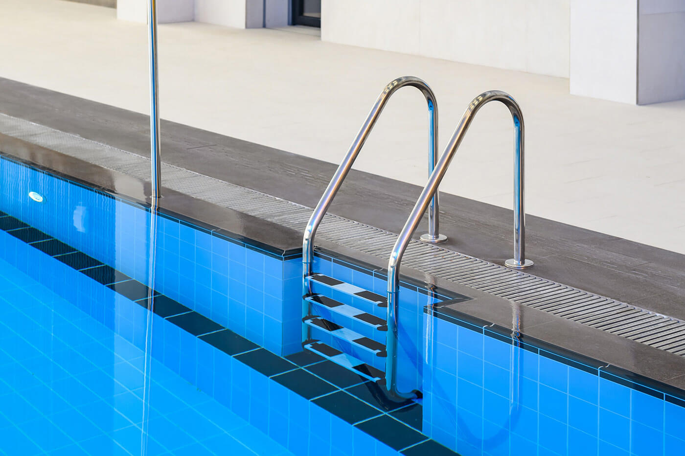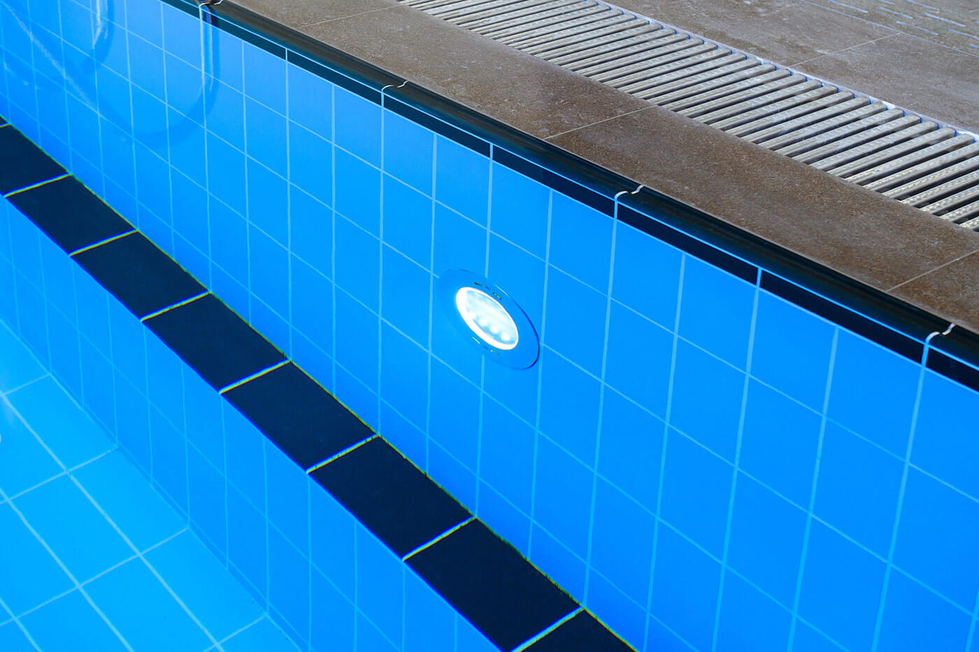 Сам бассейн также выполнен в немецкой плитке, здесь мы применили нестандартный прием сочетания цветовых решений: для оформления линии разметки, ступени отдыха и рукохвата -выбрали черный цвет, фоновая плитка – лазурная.