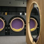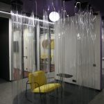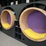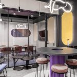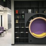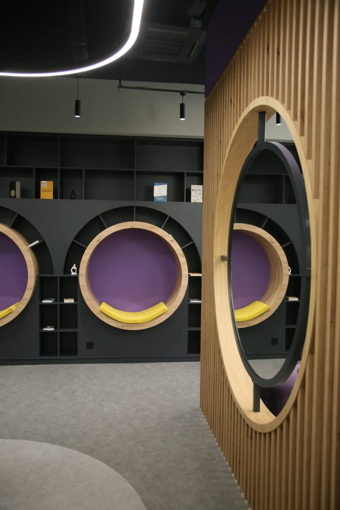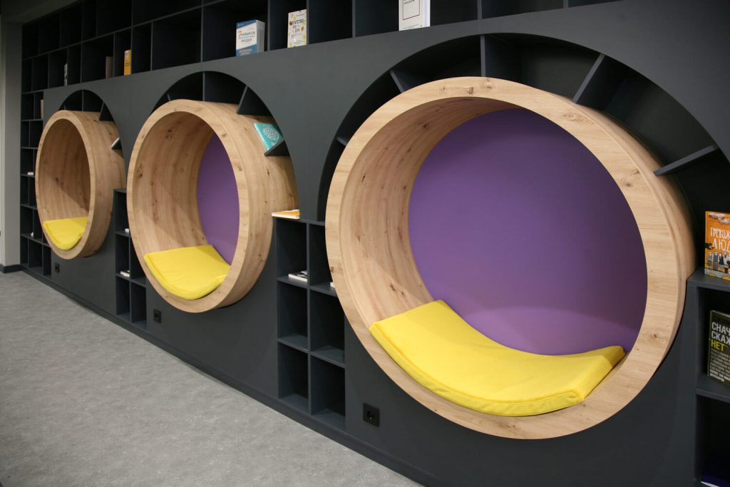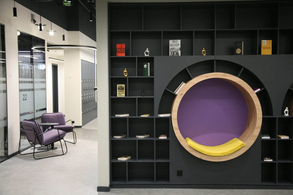 Мебельные группы интегрируются в общее пространство за счет строгости форм и сдержанной цветовой палитры — металлические каркасы, лаконичные диваны и кресла с минимальным декором. Встроенные системы хранения и книжные стеллажи решены в виде строгих монохромных модулей, в которых встречаются яркие акцентные ниши и оригинальные элементы геометрии (круглые ниши для релакса, интегрированные в стеллажи).