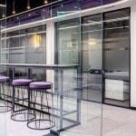 В цветовом решении доминируют холодные технологичные оттенки: графитовый, антрацитовый, различные градации серого и черного, а также белоснежные поверхности. В качестве акцентов используются насыщенные, но лаконичные цвета — фиолетовые, оранжевые и желтые вставки на мягкой мебели, декоративных панелях и отделочных элементах, что оживляет пространство и придает ему дополнительную глубину.