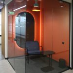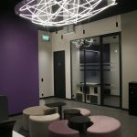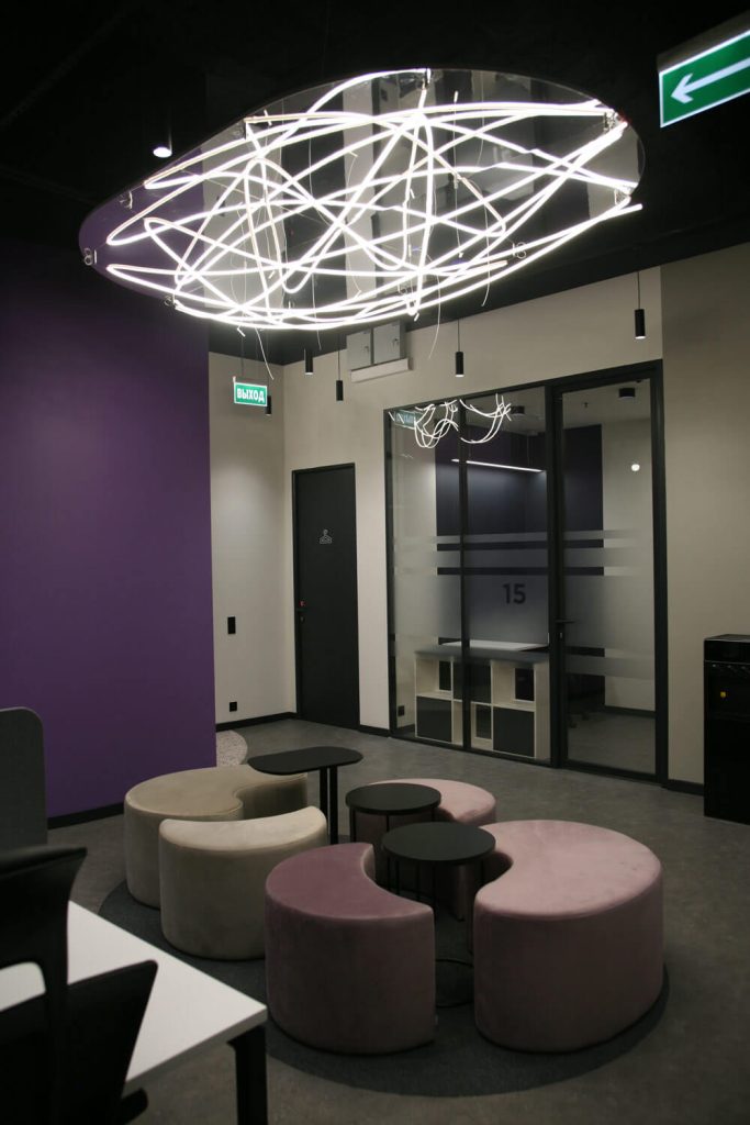 Интерьер офисного пространства выполнен в актуальной футуристической стилистике с акцентом на строгость геометрии и минимализм в деталях. Форма архитектурных элементов продумана до мельчайших нюансов: преобладают четкие прямолинейные и округлые объемы, наделяющие пространство особой ритмикой и динамикой.