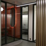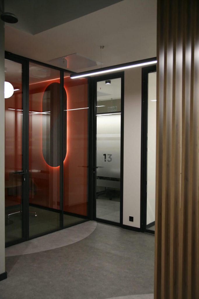 Основная концепция отделки строится на сочетании лаконичных, но технологичных материалов. В отделке стен применяются гладкие монохромные поверхности со сложными фактурами, а также матовые и глянцевые панели контрастных оттенков. Широко используются тонированные стеклянные перегородки, которые обеспечивают прозрачность коммуникаций и поддерживают визуальную легкость пространства. Потолки и встроенная система освещения имеют графичную структуру и подчеркивают направления движения внутри офиса — используются как прямолинейные световые линии, так и динамичные неоновые светильники органической формы.
