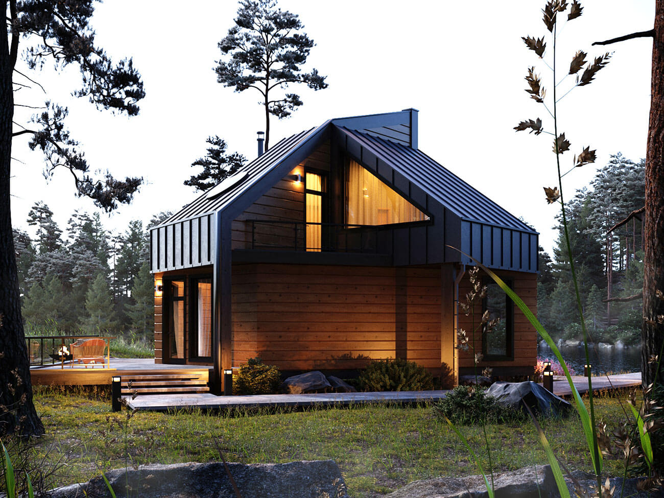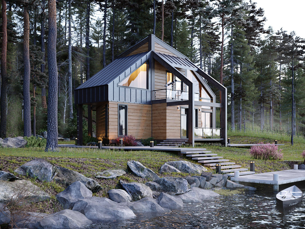 Дом проектировался под типовую единицу базы отдыха на берегу озера, но оказался актуален и в частном сегменте как доступное загородное жилье, отвечающее современным тенденциях проживания и возможностью в реализации.