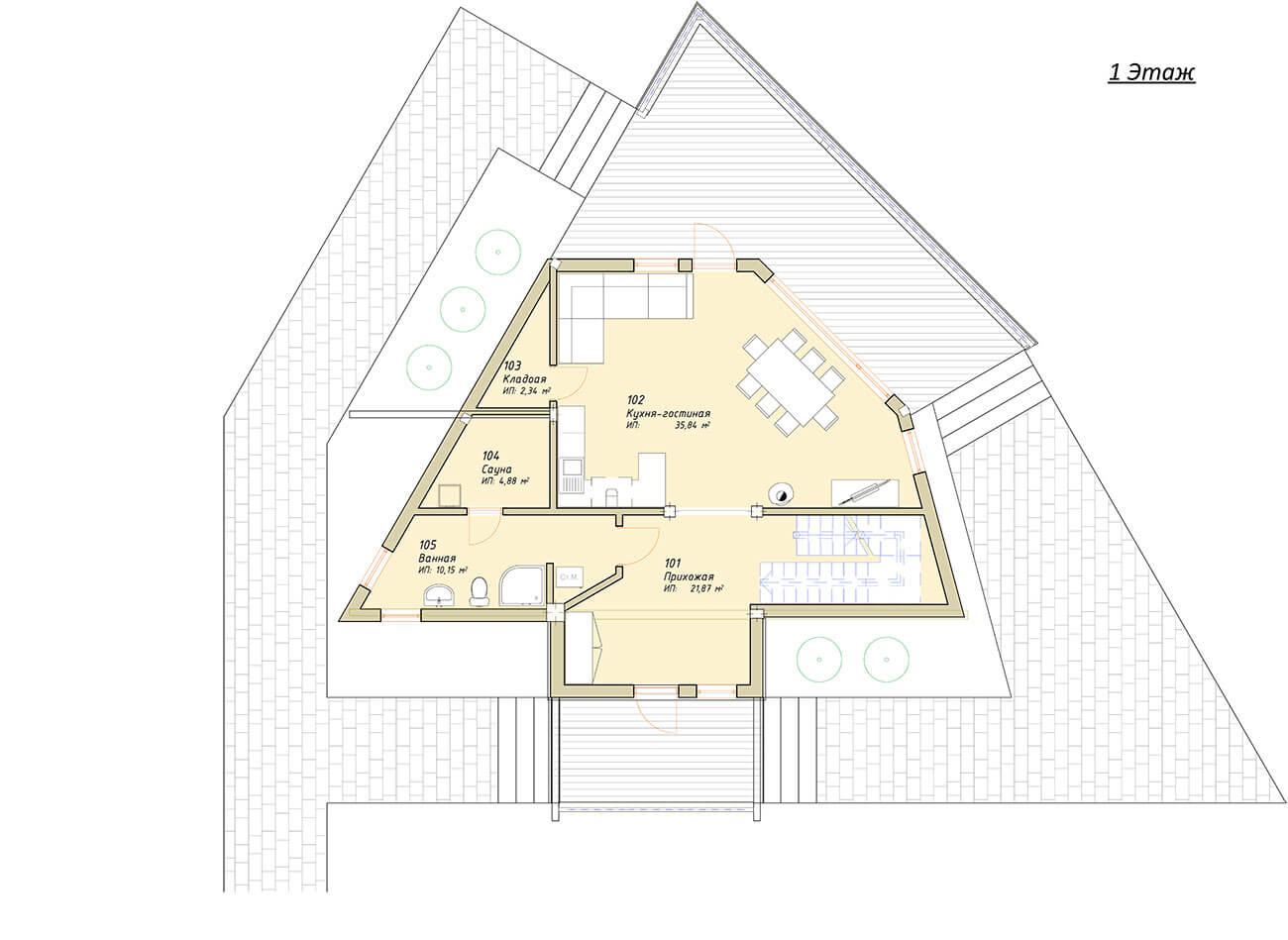 Строительная основа дома — деревянный каркас на сваях. Идея по реализации дома — возможность выбора как заполняющих материалов (стены, перекрытия, кровля), так и внутреннего убранства, с вариативной комбинацией перегородок под разные сценарии проживания — не меняя за счет этого художественного образа.