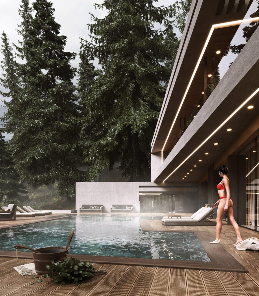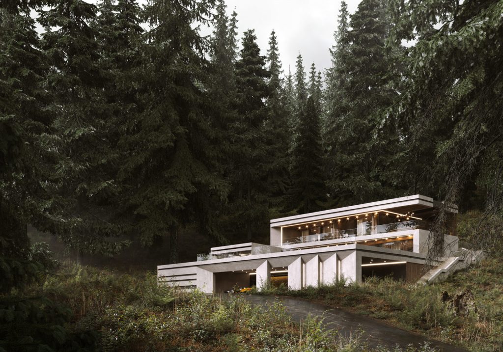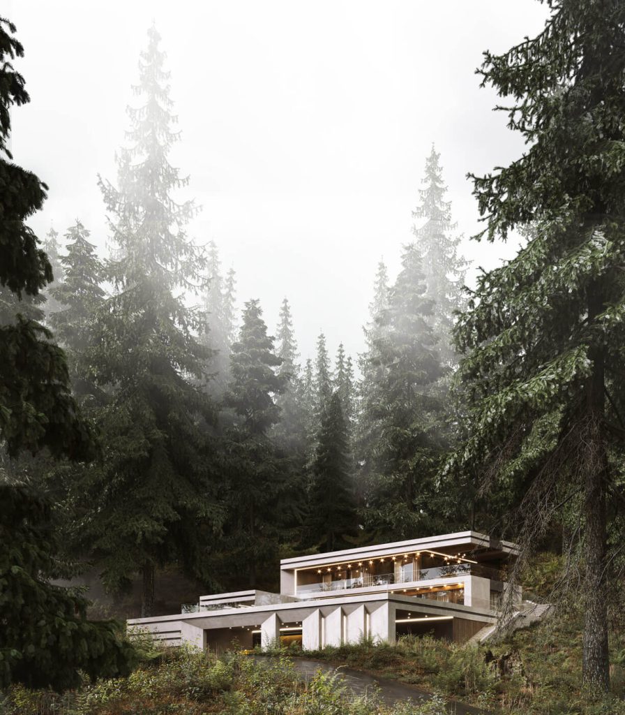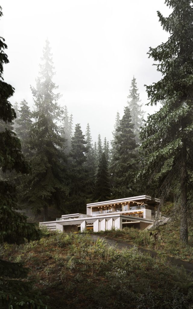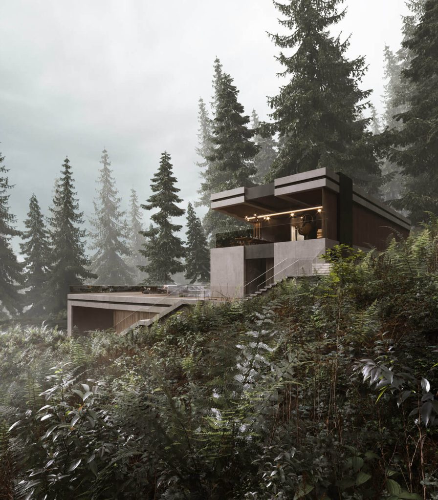 Планировочное решение первого этажа объединяет просторную кухню-гостиную с панорамным витражным остеклением, SPA-зону и вспомогательные помещения. Второй этаж отведён под спальные комнаты с индивидуальными балконами, а также общую террасу с зоной для барбекю. Фасад виллы выполнен из шлифованного бетона с интеграцией элементов из массива дерева, создавая стильный образ, который органично вписывается в окружающий природный контекст.