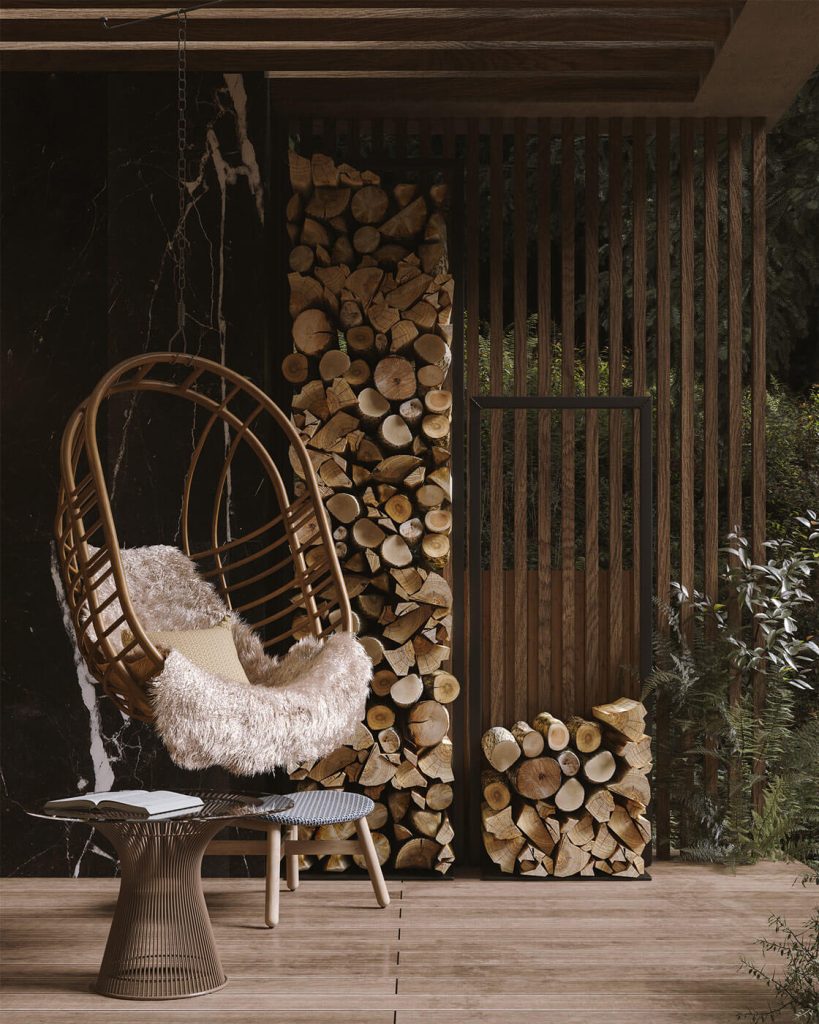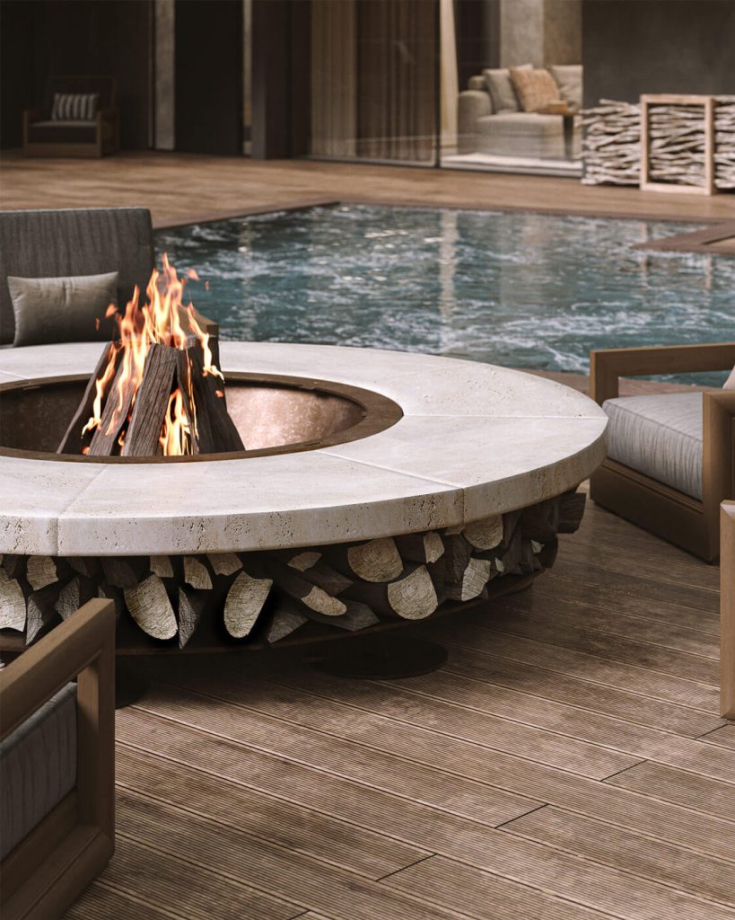 Ландшафт территории решён с использованием нескольких функциональных уровней, что позволяет эффективно использовать естественные перепады высот. В нижнем уровне располагается стилобат, в котором организован гараж и технические помещения. Автомобильный пандус ведёт к среднему уровню, где предусмотрен навес для автомобилей. Поднявшись по лестнице, мы оказываемся на верхнем уровне, на котором размещается подогреваемый бассейн, терраса и зона отдыха. Для обеспечения комфорта в холодное время года площадки вокруг бассейна оборудованы системами антиобледенения и снеготаяния, что позволяет использовать пространство внутреннего двора круглый год.