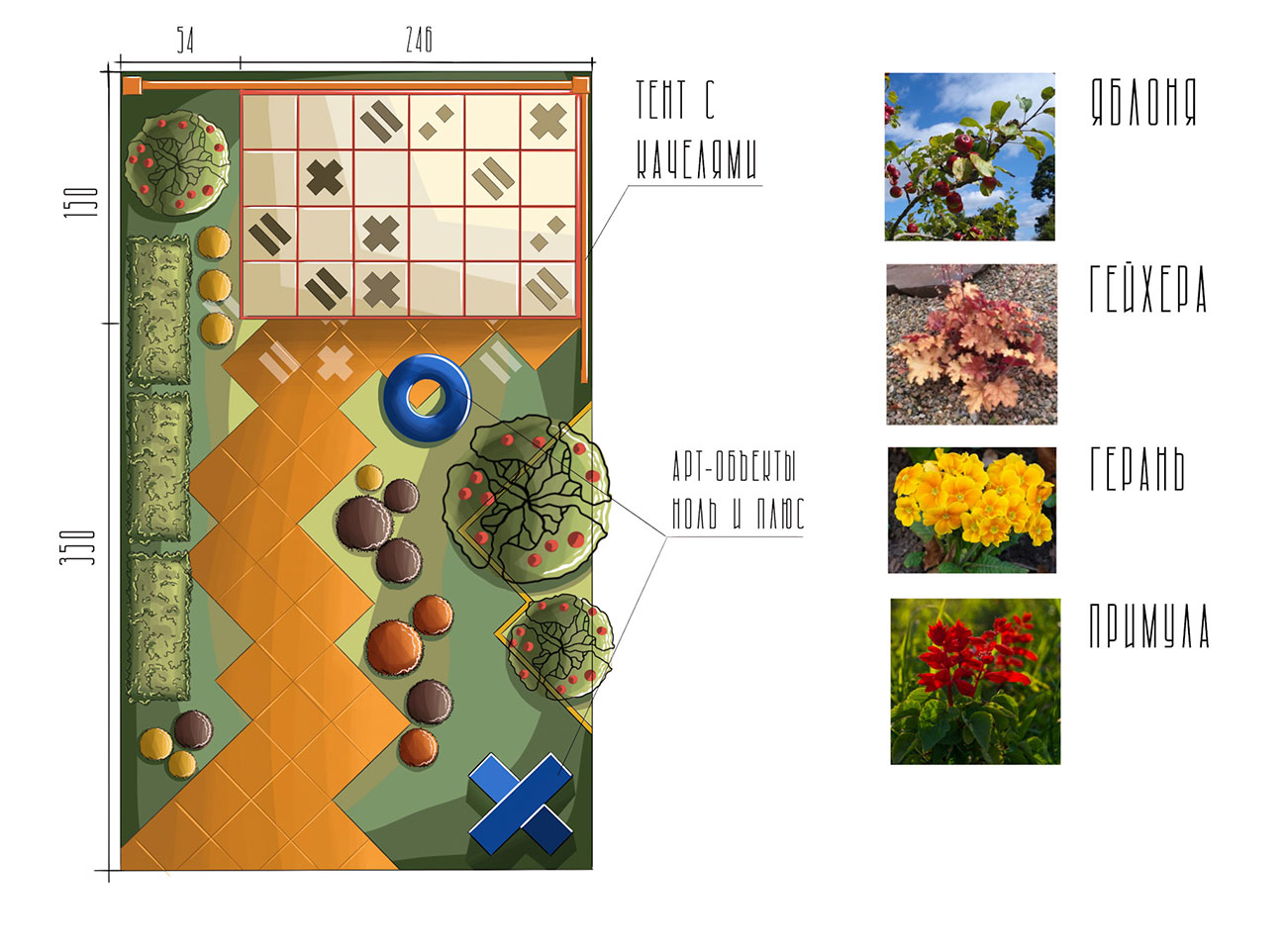 Предпочтение было отдано таким растениям, как яблоня декоративная Маковецкого (Malus Makowieckiana), гейхера Миракл (Heuchera ‘Miracle’), желтая пеларгония (Pelargonium articulatum), полиантовая примула (Рrimula poliantha). Главные критерии выбора ассортимента — выразительность и доступность растений.