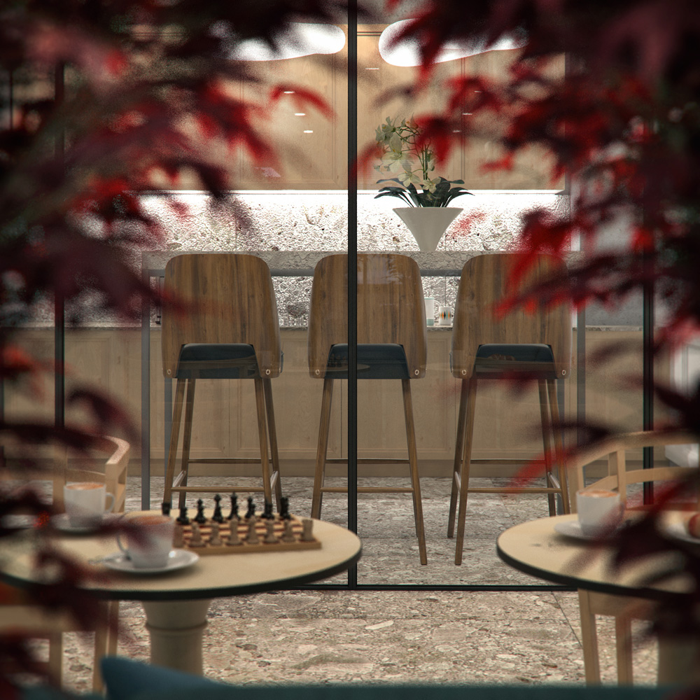 Глубокая пластика скульптурного бетона стеновых панелей работает на контрасте с полировкой камня на полу и теплой столяркой.