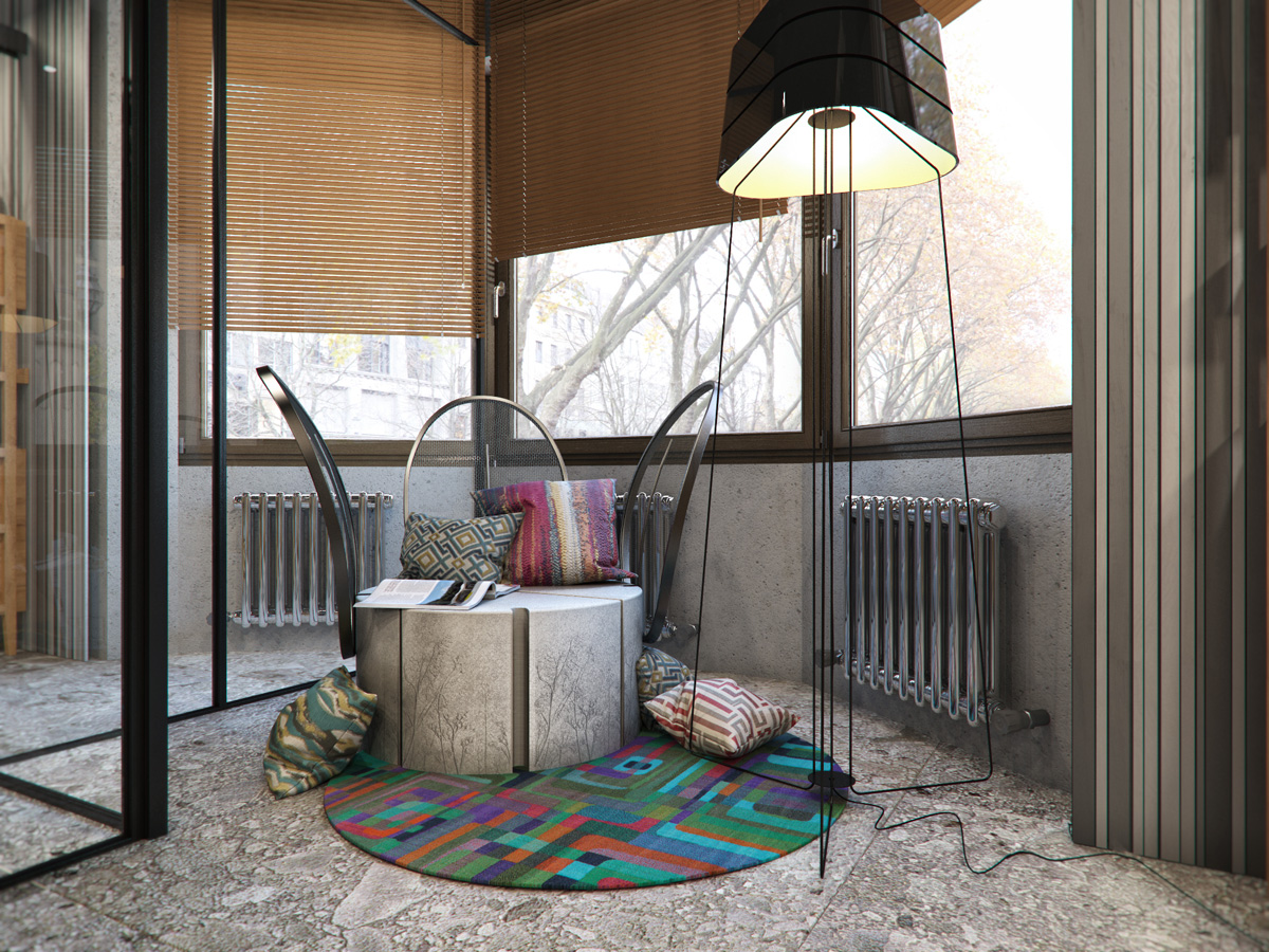Первобытность в ощущениях. Здесь даже профиля остекления выглядят как редкий подлесок. Такой сложный пирог из урбанистических, техногенных решений и тотемных предметов VERESKI из декоративного бетона.