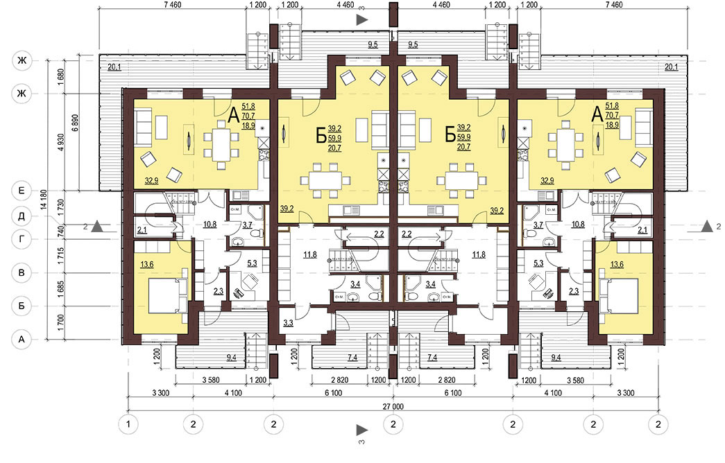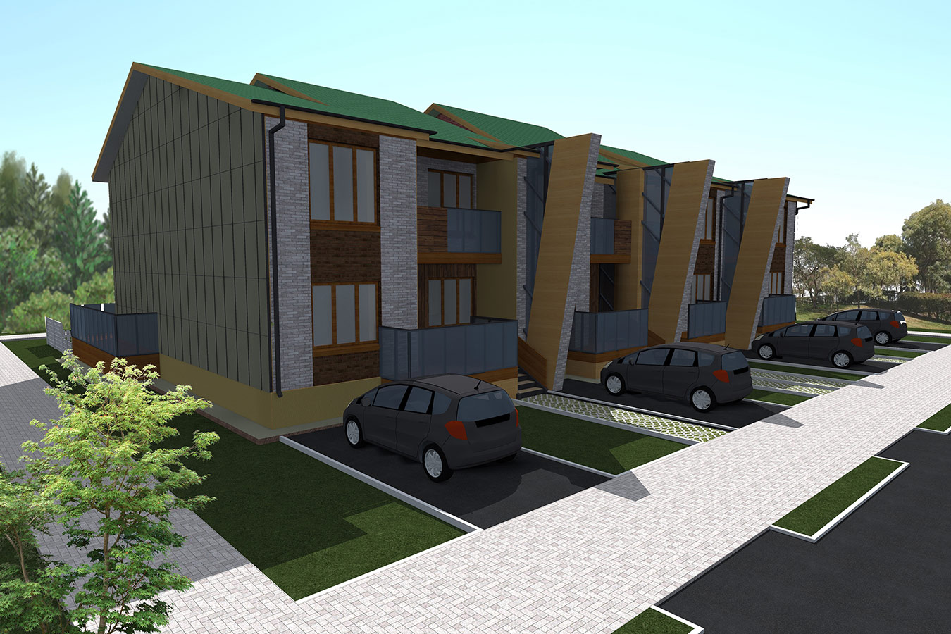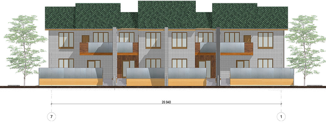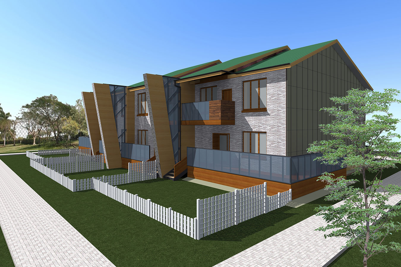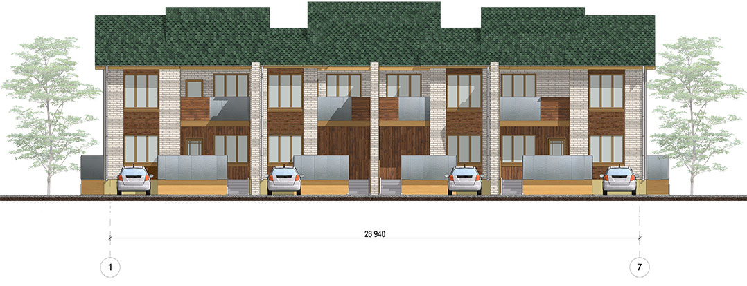 Для отделки фасадов использованы навесные плиты, декорированные под кирпич (белый/коричневый) и дерево. Ограждения выполнены из стеклянных панелей с металлическим каркасом. Кровля сложная, многоуровневая, выполнена из зеленой черепицы. Разделение жилых ячеек осуществляется с помощью декоративных стен по всей высоте фасада.