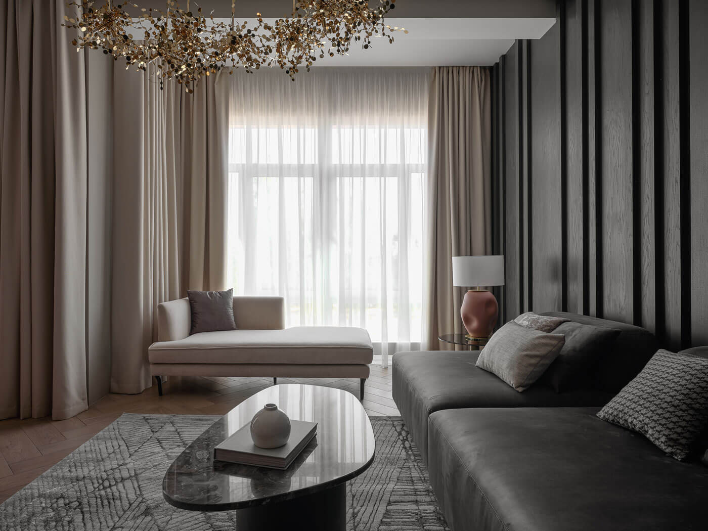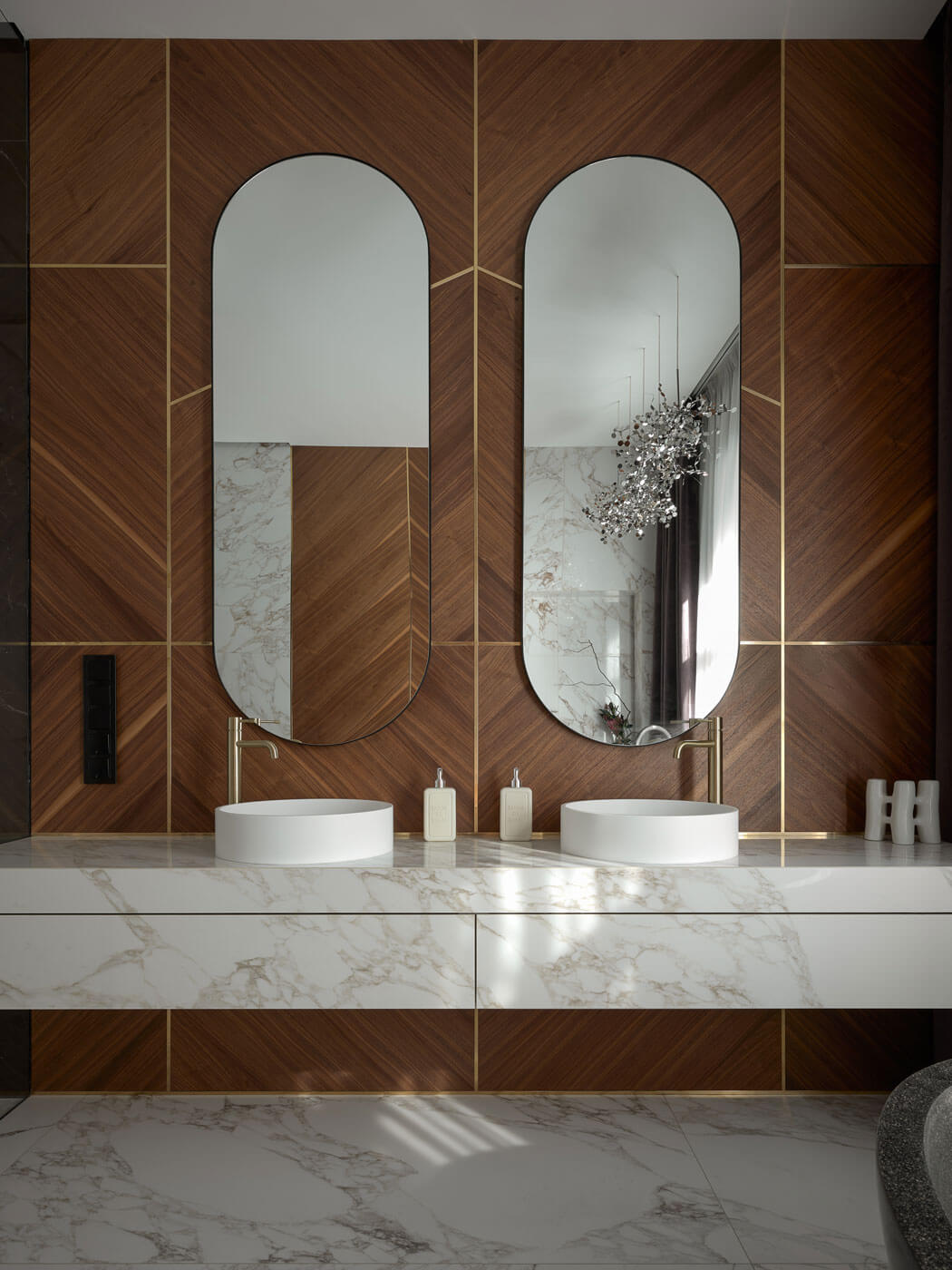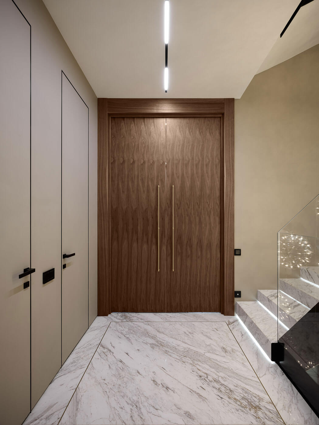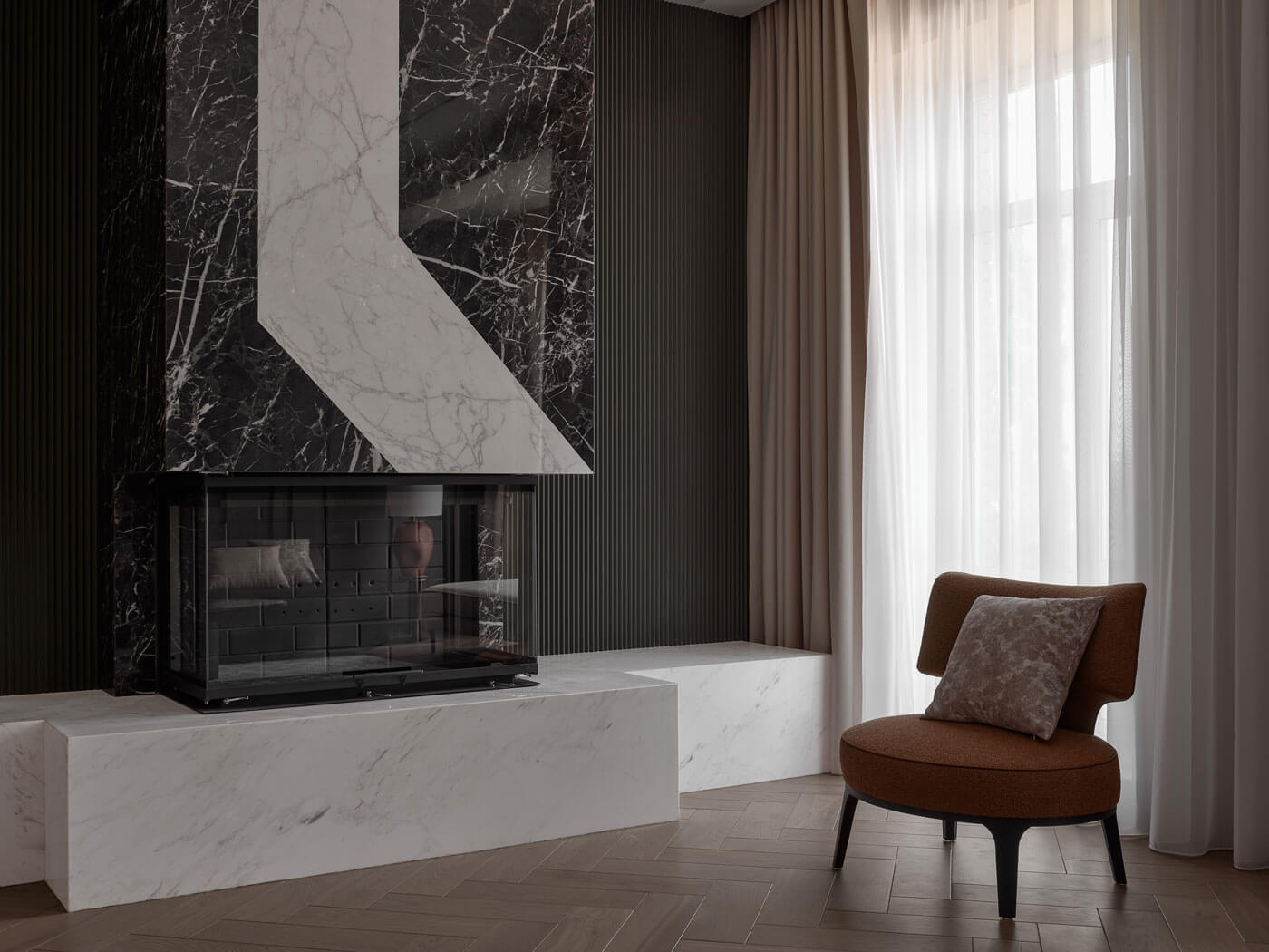 Проект таунхауса в уединенной части Воронежской набережной. Основным акцентным материалом, притягивающим внимание, является натуральный мрамор. Им облицован камин в зоне гостиной, панно за изголовьем кровати – также из мрамора, он же (черного цвета) – в ванной комнате. Холодную красоту камня мы решили везде дополнить натуральным деревом. Так в гостиной появилась идея шпонированной рельефной стены за диваном, в спальне – скругленные элементы в шпоне американского ореха и такой же материал мы использовали в мастер ванной. Визуально он связывает и объединяет два помещения мастер блока. В проекте мы использовали большое количество зеркал и глянцевых поверхностей, которые очень красиво отражают вид за окном, придавая пространству дополнительной глубины.
