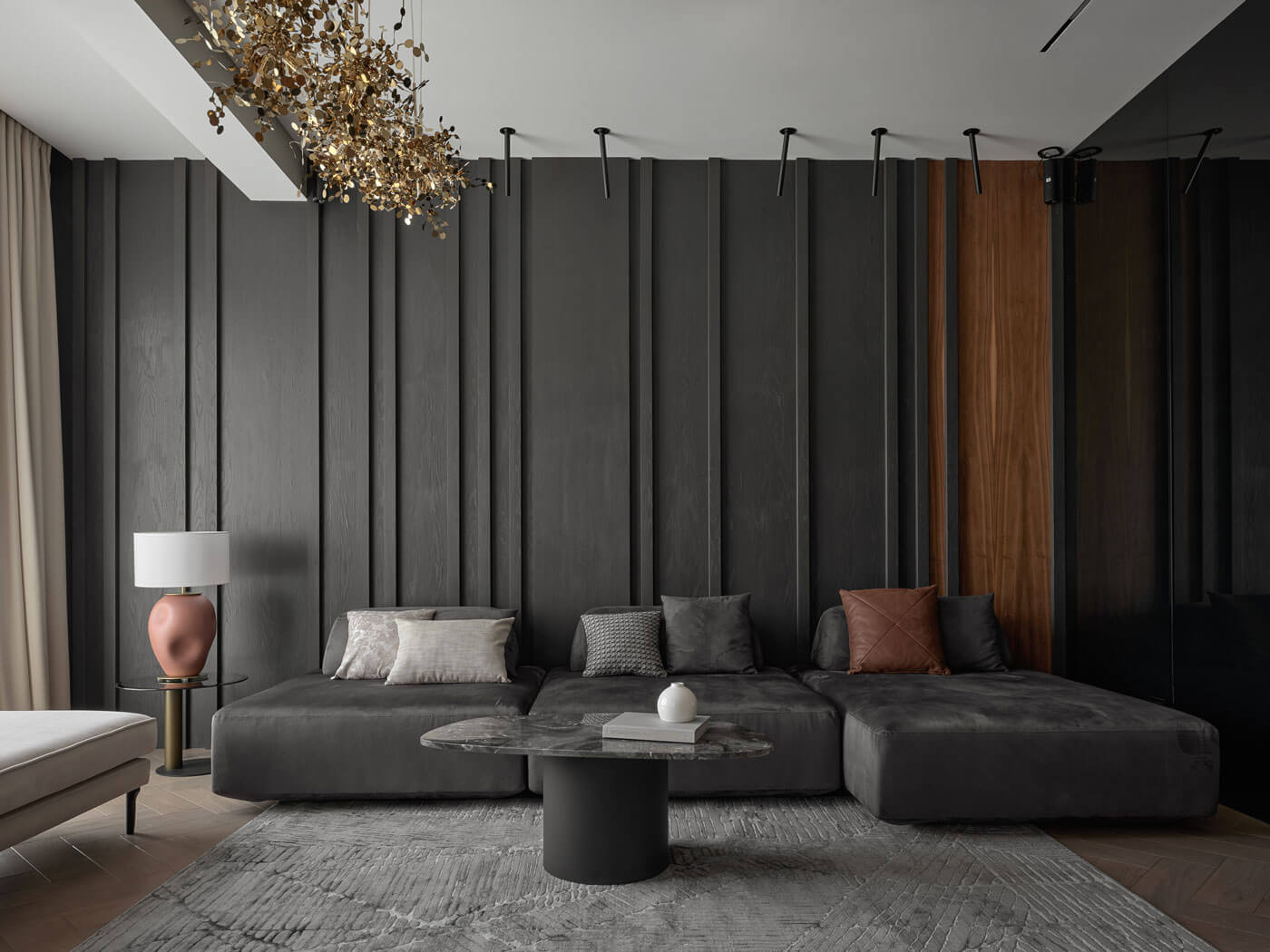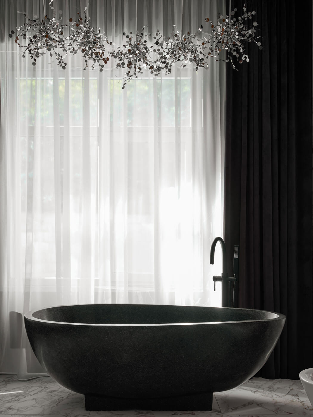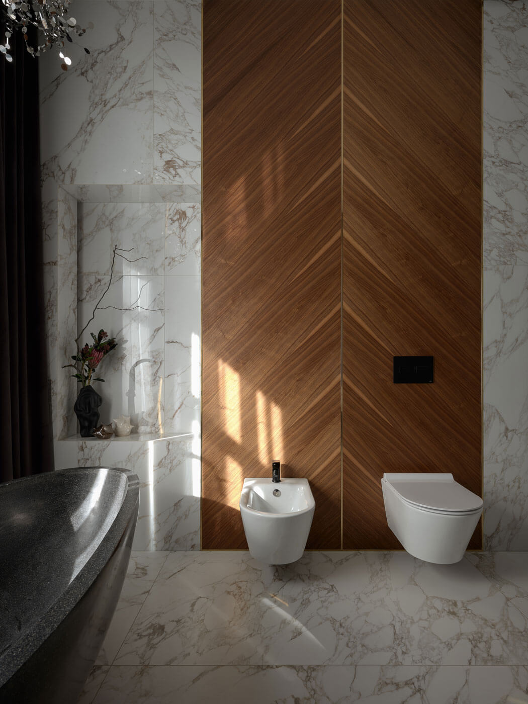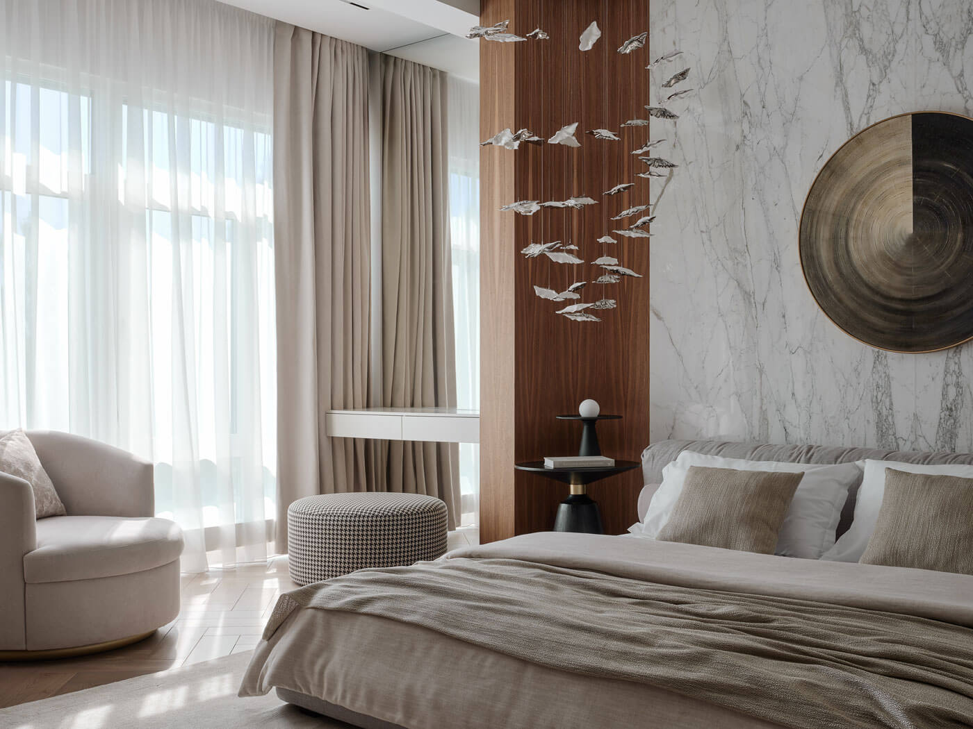 Проект таунхауса в уединенной части Воронежской набережной. Основным акцентным материалом, притягивающим внимание, является натуральный мрамор. Им облицован камин в зоне гостиной, панно за изголовьем кровати – также из мрамора, он же (черного цвета) – в ванной комнате. Холодную красоту камня мы решили везде дополнить натуральным деревом. Так в гостиной появилась идея шпонированной рельефной стены за диваном, в спальне – скругленные элементы в шпоне американского ореха и такой же материал мы использовали в мастер ванной. Визуально он связывает и объединяет два помещения мастер блока. В проекте мы использовали большое количество зеркал и глянцевых поверхностей, которые очень красиво отражают вид за окном, придавая пространству дополнительной глубины.