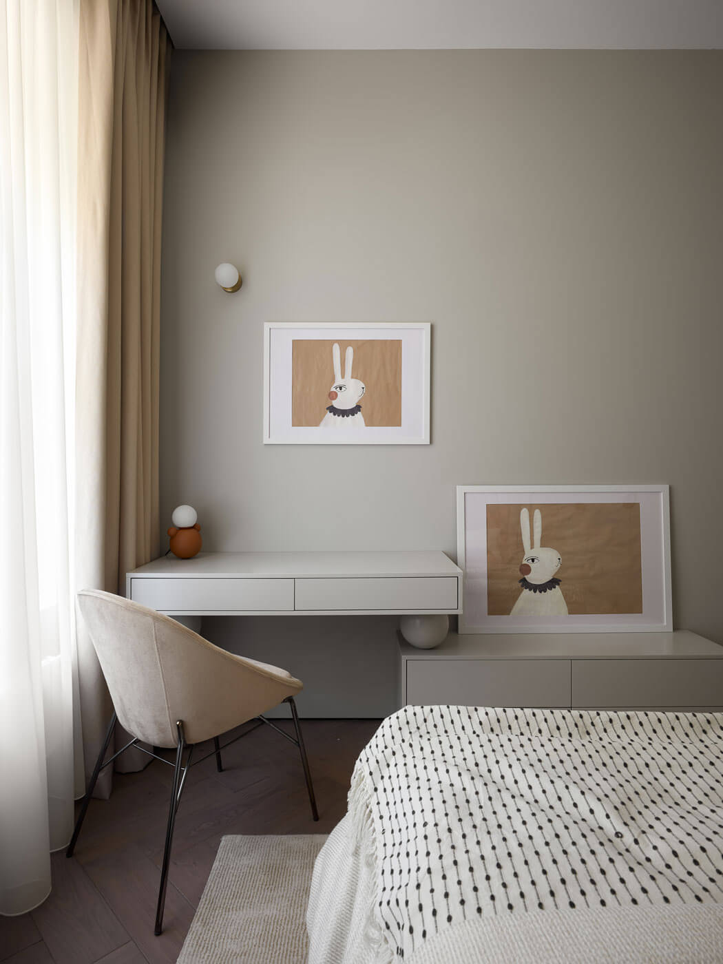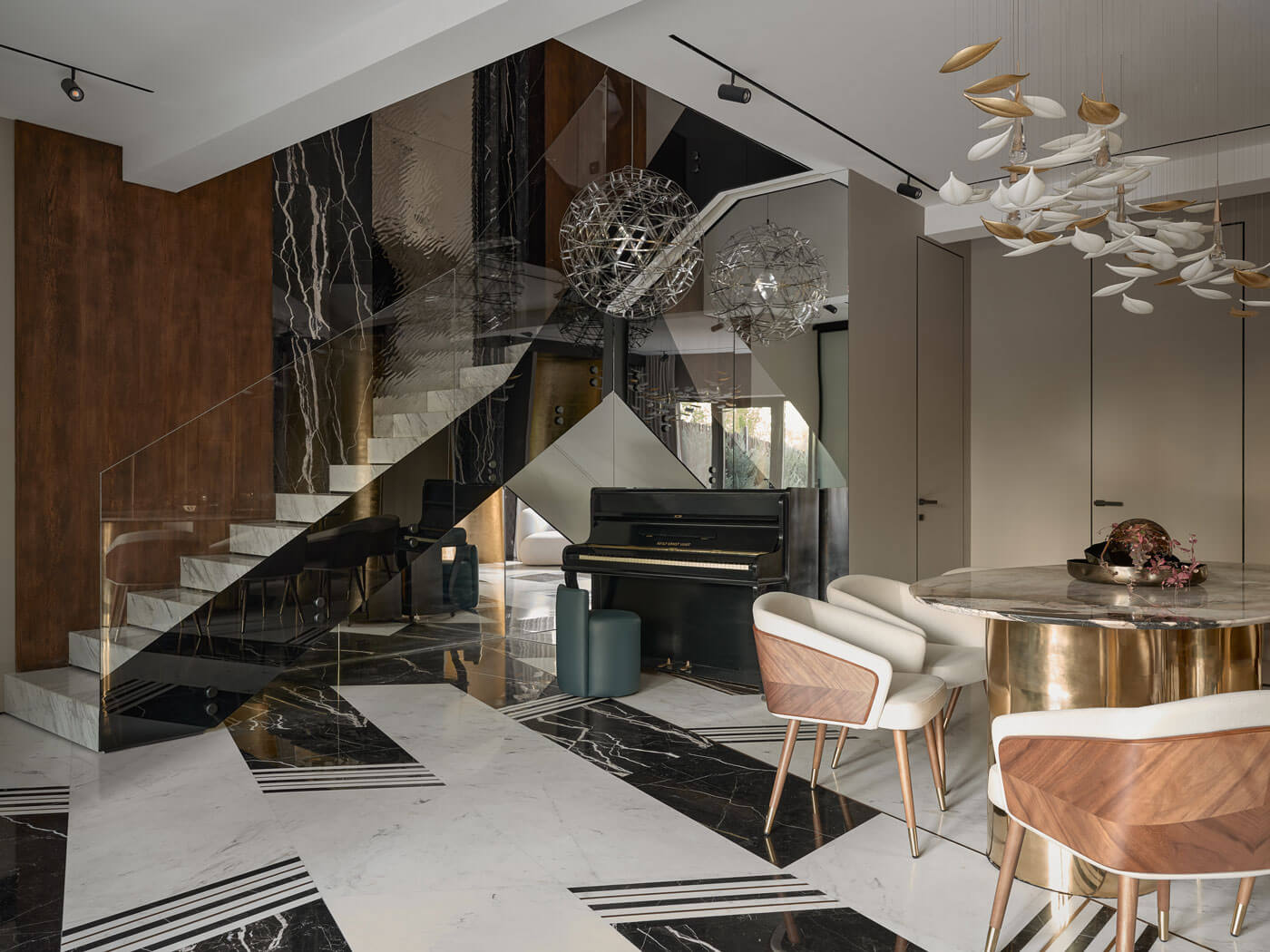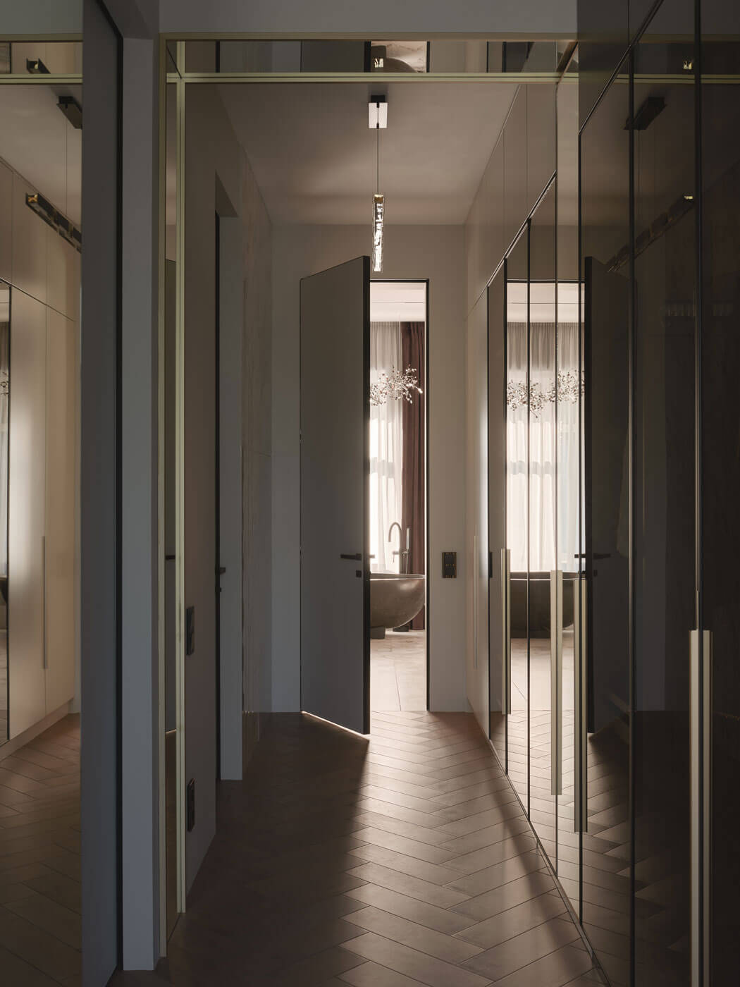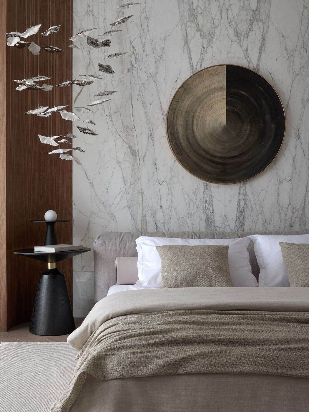 Проект таунхауса в уединенной части Воронежской набережной. Основным акцентным материалом, притягивающим внимание, является натуральный мрамор. Им облицован камин в зоне гостиной, панно за изголовьем кровати – также из мрамора, он же (черного цвета) – в ванной комнате. Холодную красоту камня мы решили везде дополнить натуральным деревом. Так в гостиной появилась идея шпонированной рельефной стены за диваном, в спальне – скругленные элементы в шпоне американского ореха и такой же материал мы использовали в мастер ванной. Визуально он связывает и объединяет два помещения мастер блока. В проекте мы использовали большое количество зеркал и глянцевых поверхностей, которые очень красиво отражают вид за окном, придавая пространству дополнительной глубины.