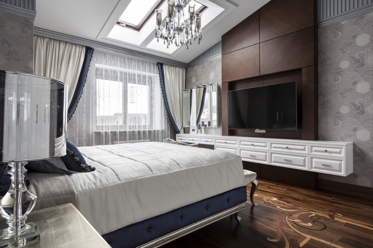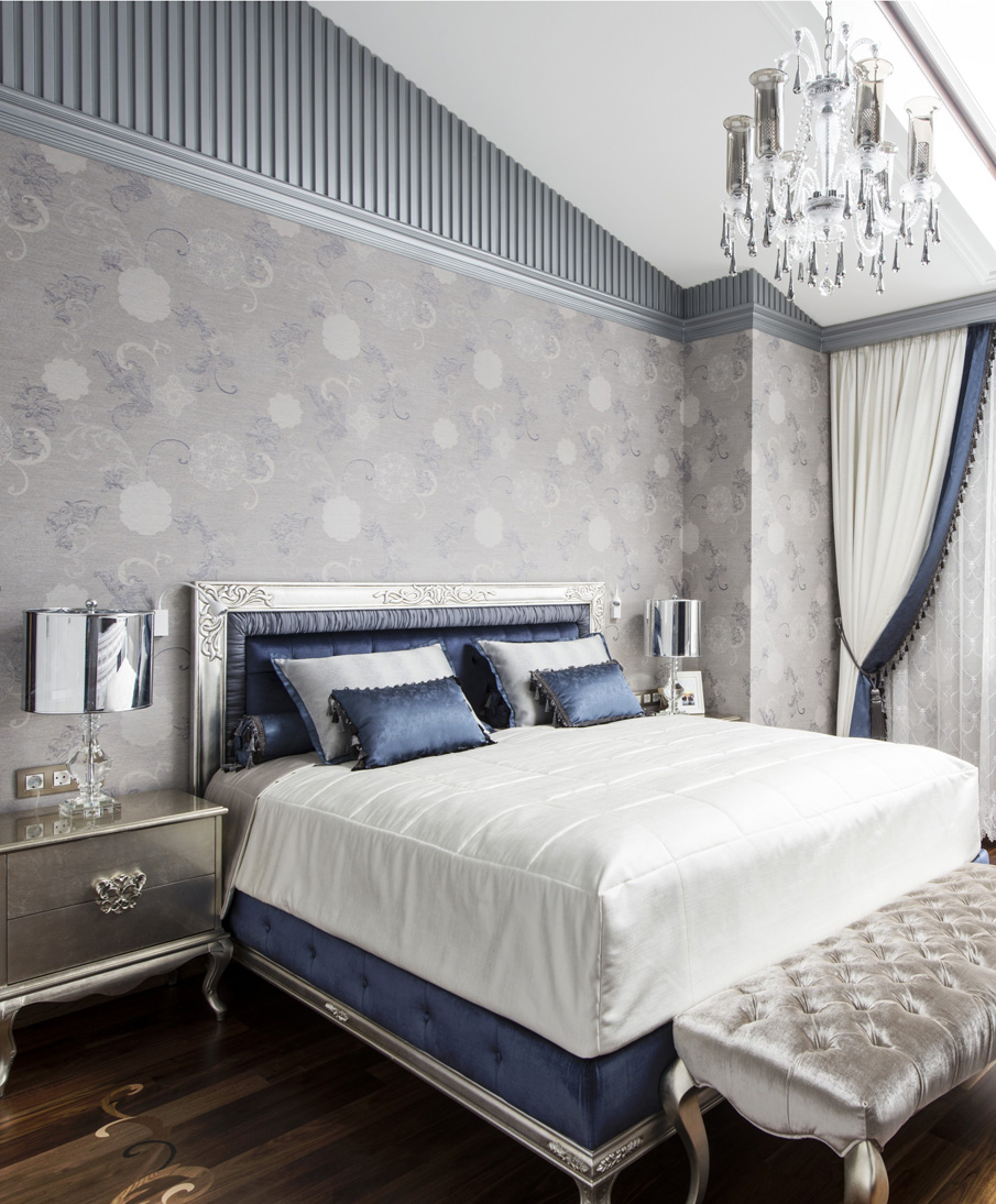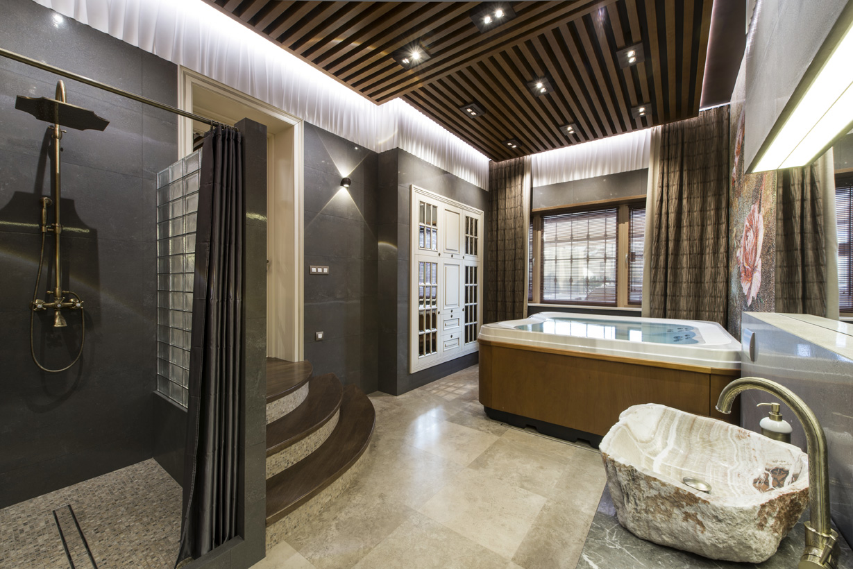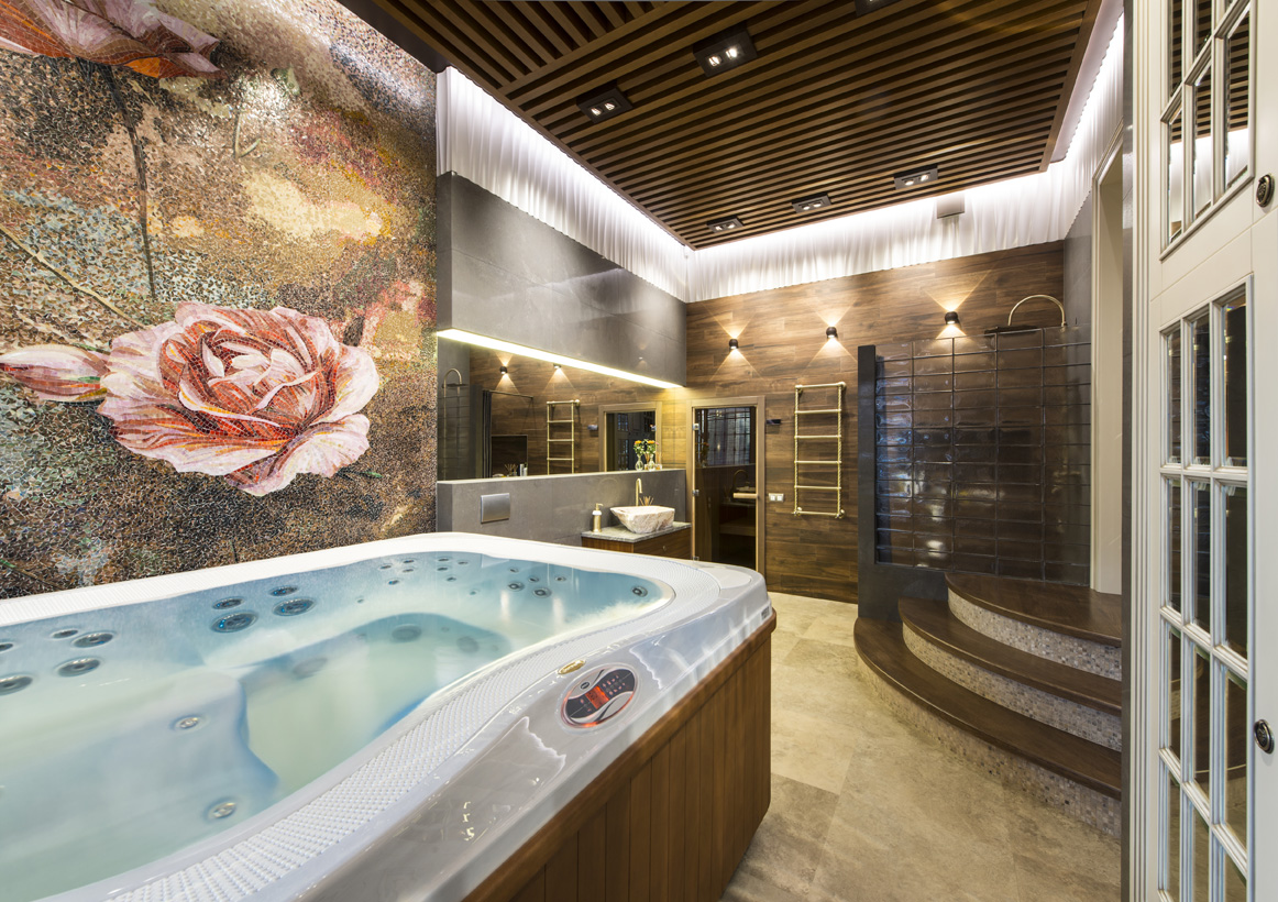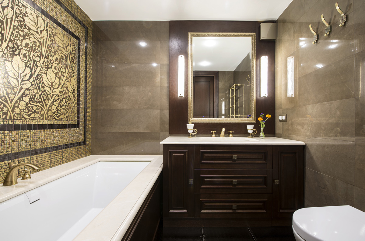 В ванной комнате акцентная стена украшена разработанным автором проекта художественным панно из мозаики Skalini и уникальной итальянской плитки Рetre antiqua, выполненной из мрамора, с нанесением в специальной технике гравировки, золотой фольги и венецианских лаков.
