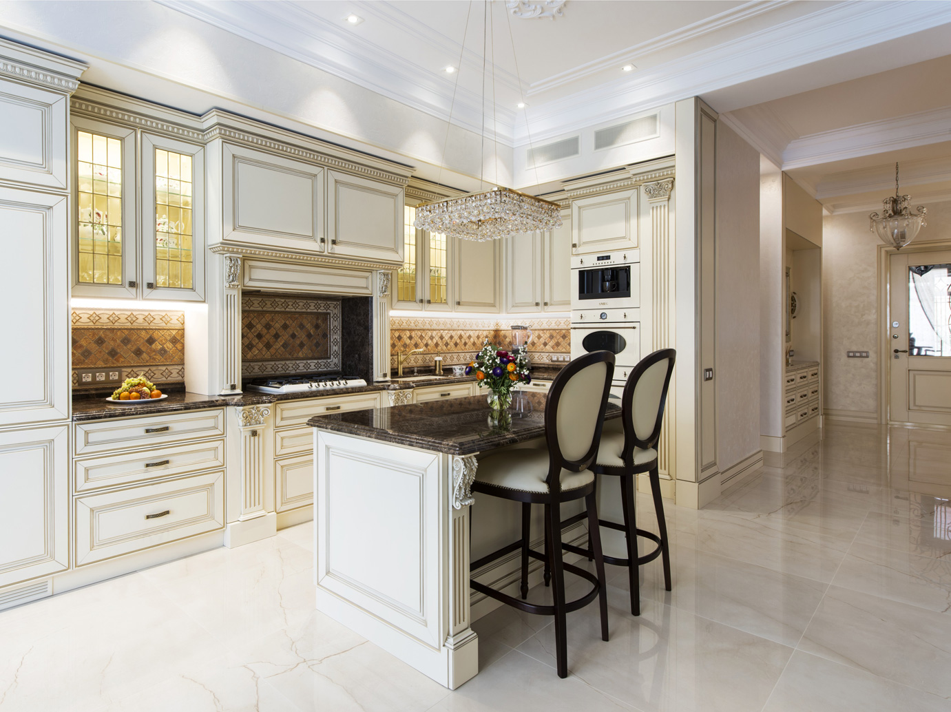 В отделке первого этажа акцент сделан на светлых, теплых тонах. Для пола выбран крупноформатный керамогранит итальянского производителя Gardenia Orchidea с полированной поверхностью и имитацией рисунка натурального мрамора. Столешницы рабочей поверхности кухни и острова сделаны из мрамора «Имперадор Дарк». Его контрастный серо-коричневый цвет дополняет фартук из мраморной плитки Skalini с технологией металлизации и оригинальными декорами.