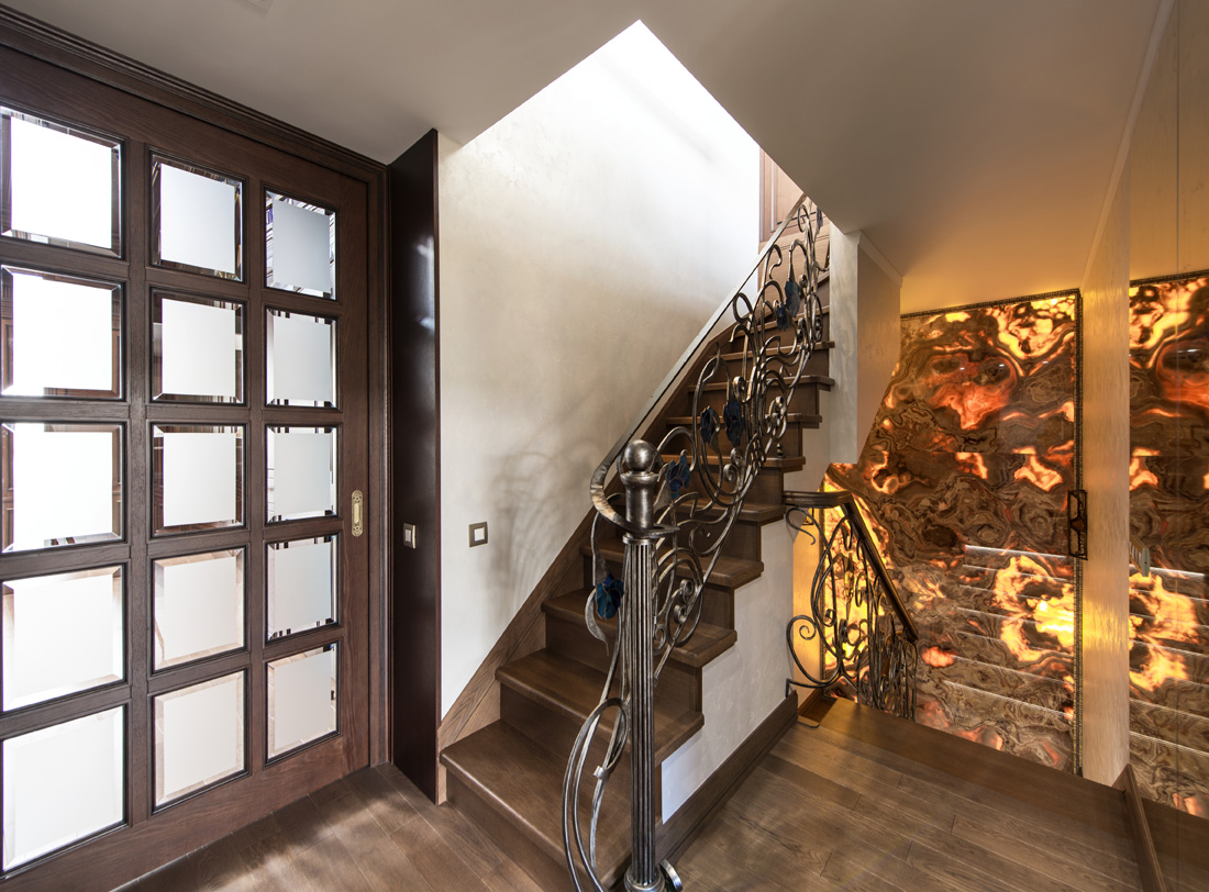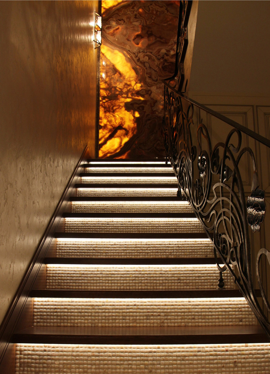 Пролет между первым и вторым этажами украшает стена, собранная из трех слебов натурального оникса с подсветкой. Рисунок оникса состыкован таким образом, чтобы текстура камня воспринималась единым целым.