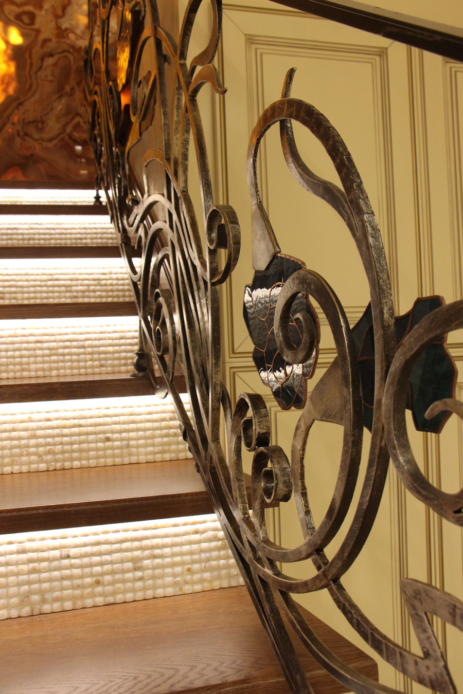 На второй этаж ведет лестница с ажурным кованым ограждением. Ступени выполнены из дуба, подступенки отделаны мозаикой из перламутра (композит натурального происхождения). Скрытая подсветка каждой ступени подчеркивает эффектные переливы материала.
