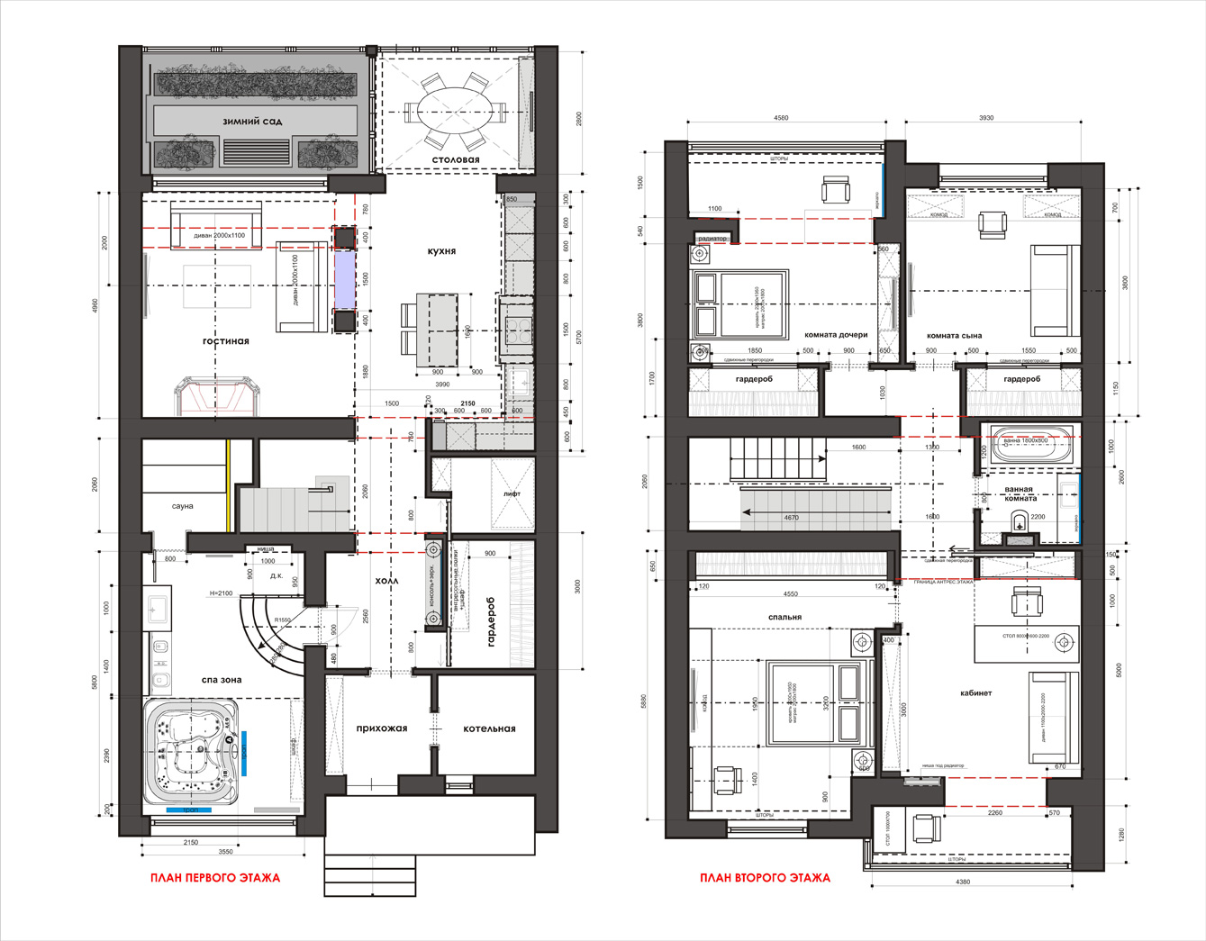 На втором этаже размещаются приватные помещения — спальни, хозяйская и две детские, кабинет, а также антресольный этаж, где расположена библиотека.