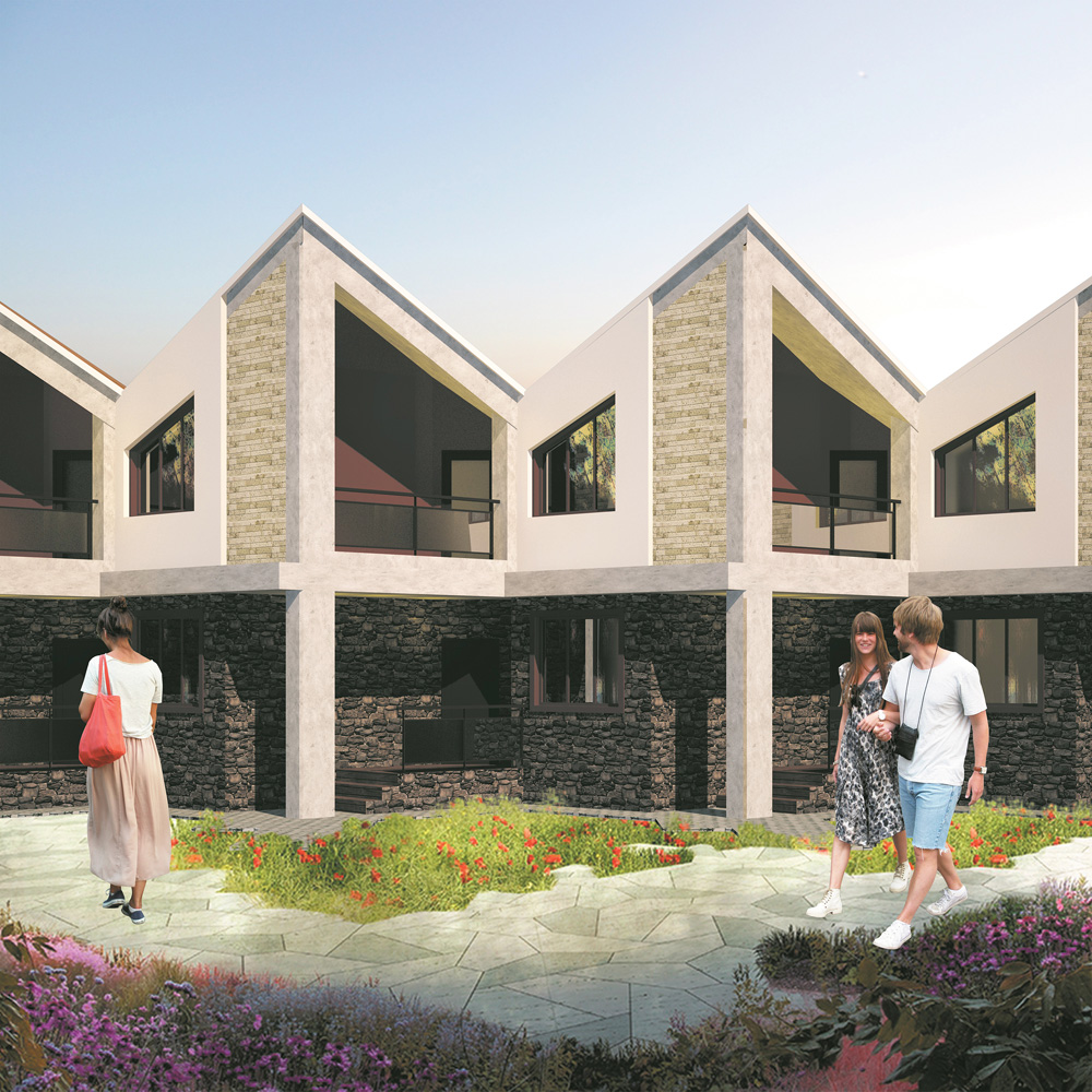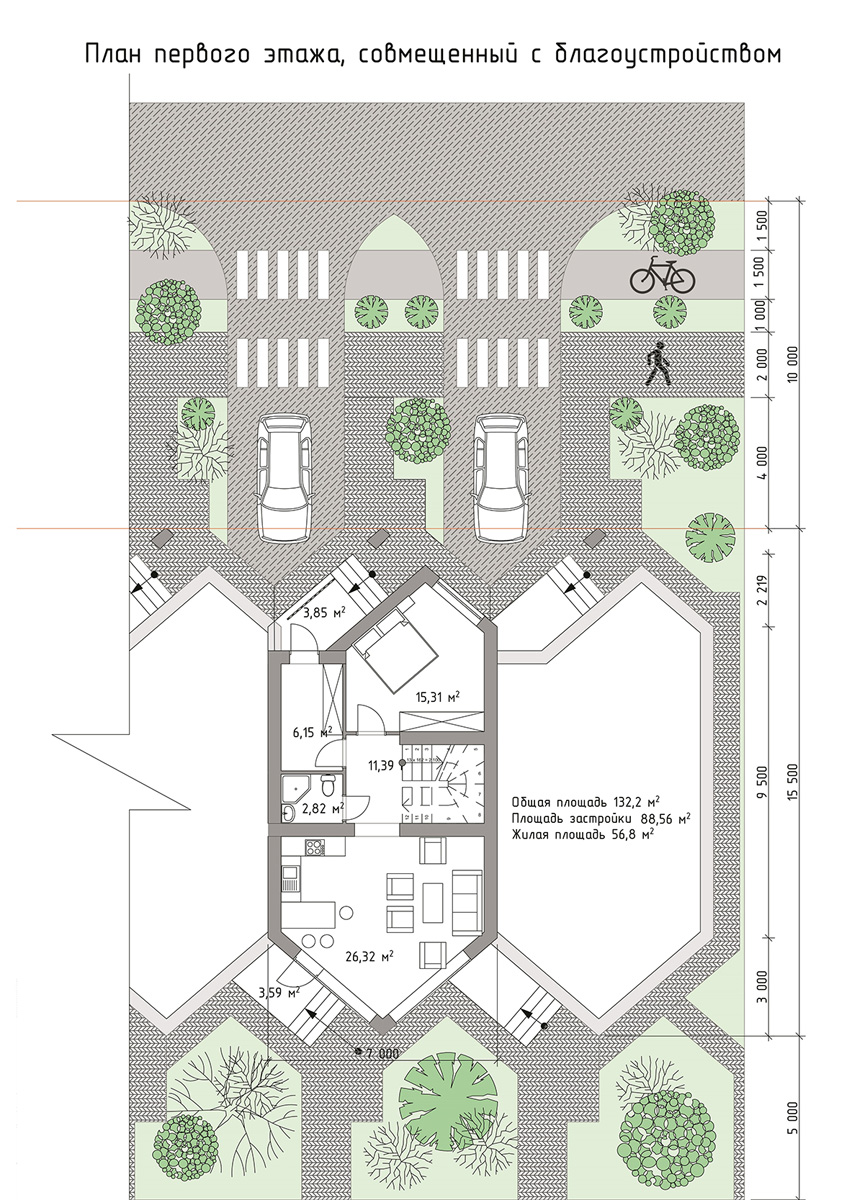 Жилой дом блокированной застройки. Общая площадь двухэтажного дома из газоблока – 132,2 м². На 1-м этаже расположены просторная гостиная, кухня-столовая, спальня, санузел и выход во двор с другой стороны дома. На 2-м этаже: 3 спальни, ванная комната. Имеется придворовая парковка у каждого блока.