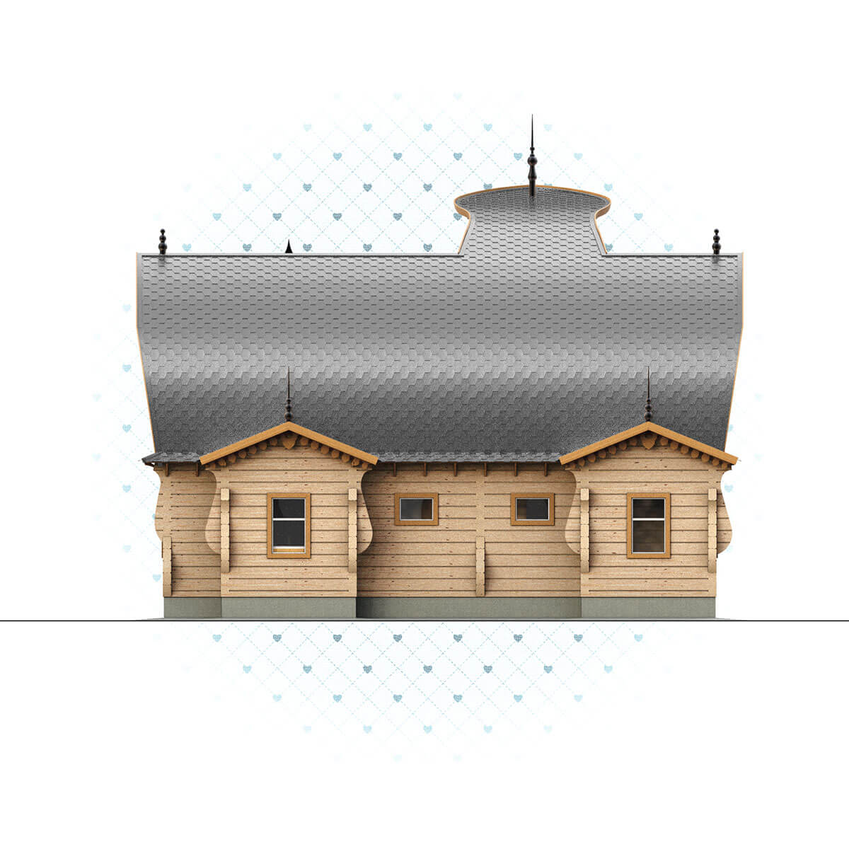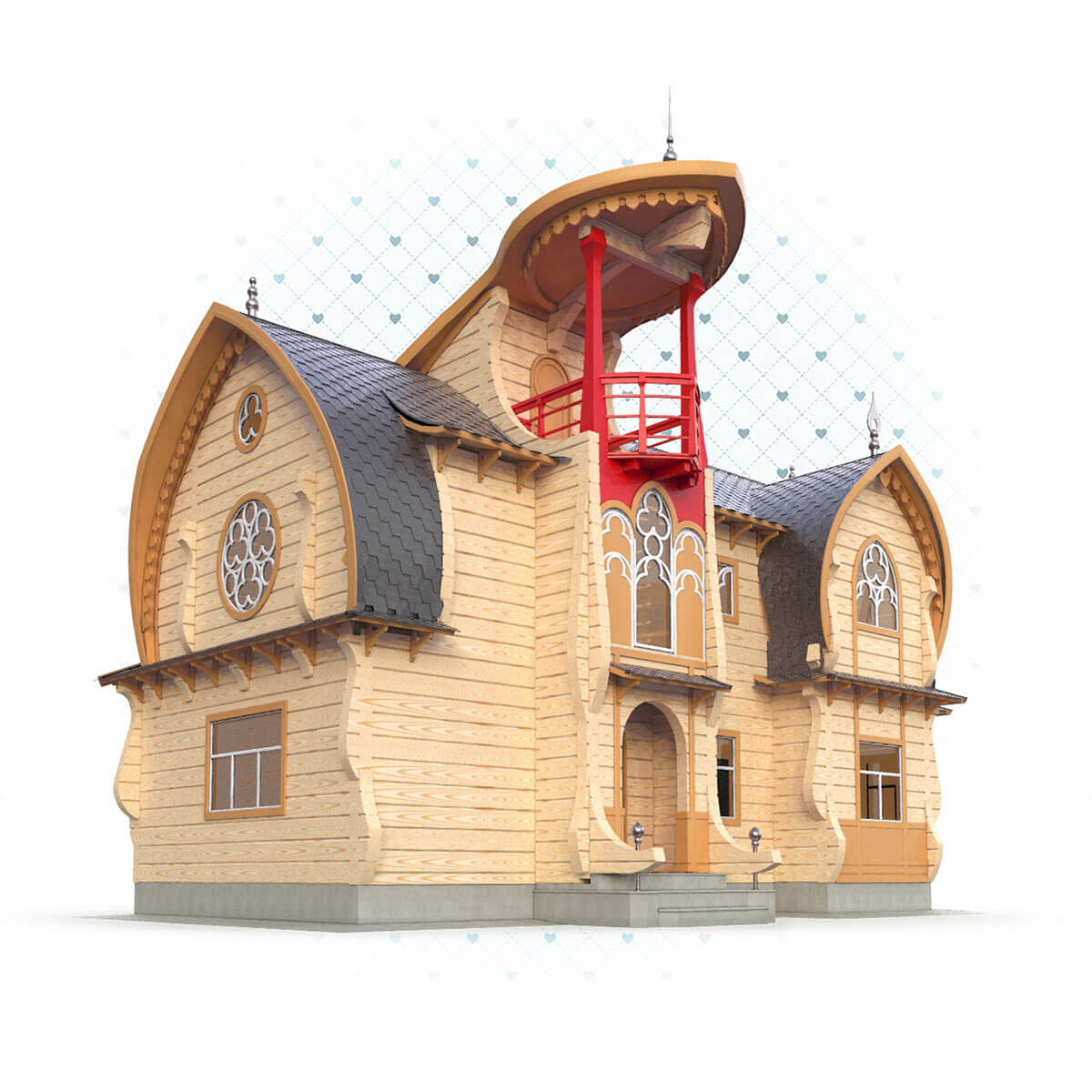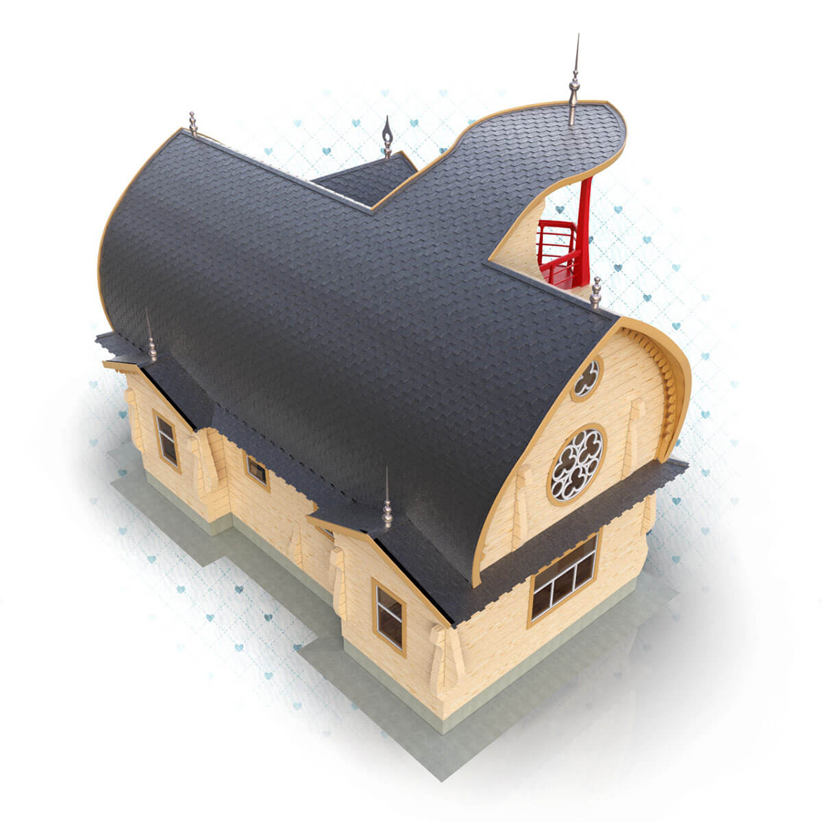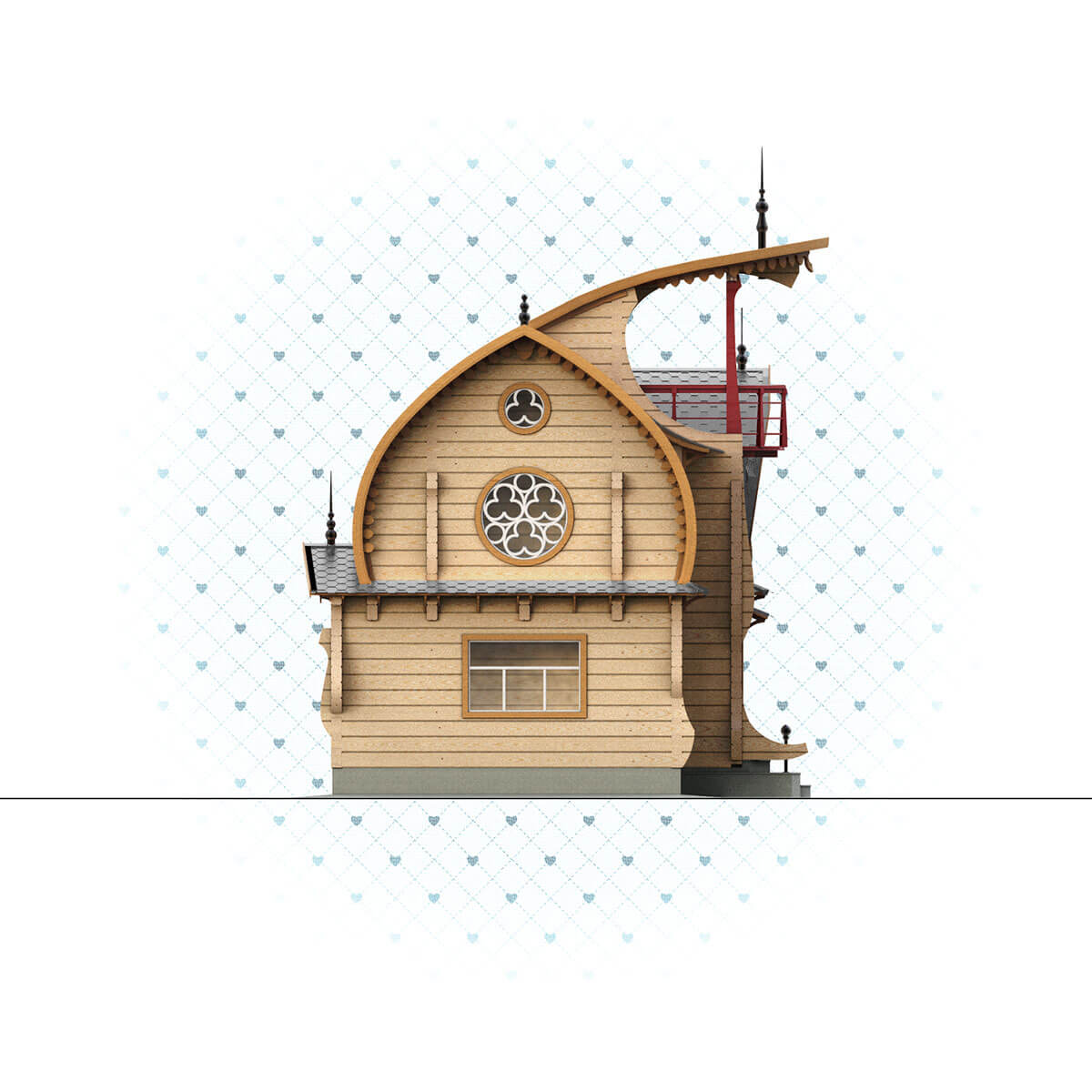 Базовый элемент, который использовался в построении всего объема — это славянский кокошник. Раньше он использовался довольно часто. В моем случае однако после длительных поисков он стал напоминать березовый лист. Сегодня этот элемент сохранился разве что в архитектуре культовых сооружений. Верность традициям не дала проникнуть туда разлагающим тенденциям мейнстримной культуры и церковники не уверовали в красоту бетонных коробок. В отличие от нас...