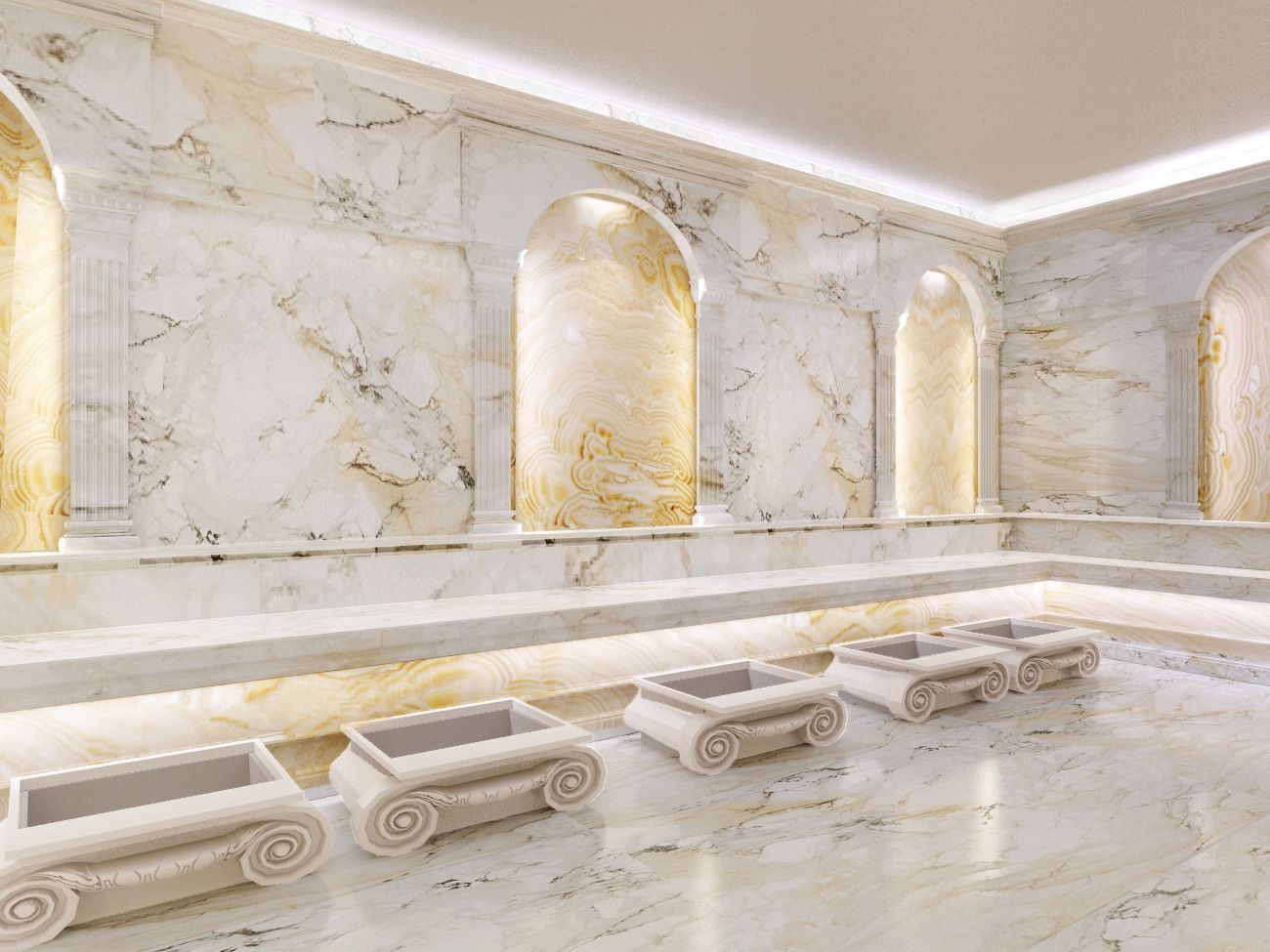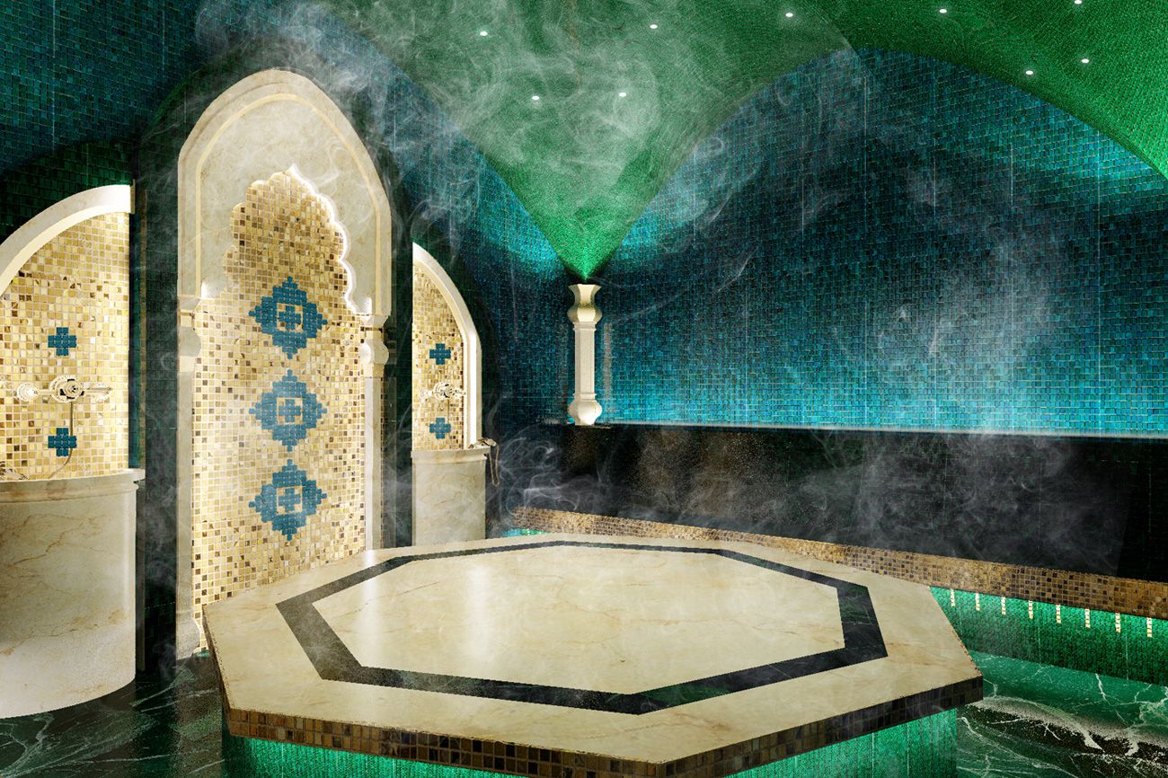 Зона Востока сформирована арочной галереей с восточным орнаментом. Хаммам выполнен в сине-зеленых оттенках с использованием мраморных изделий.