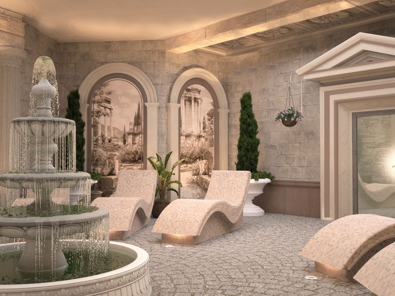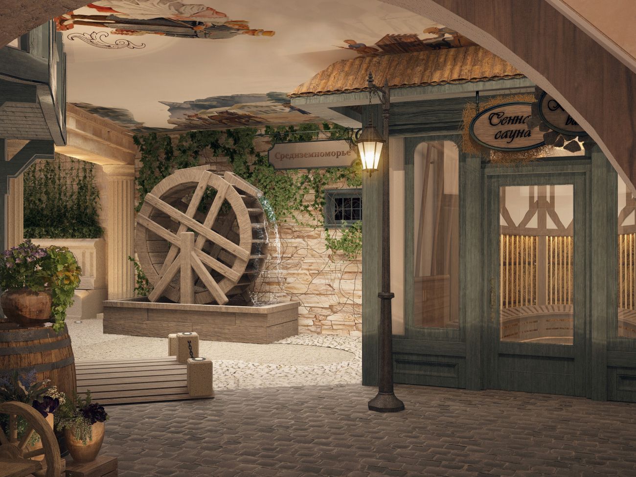 Зона Средиземноморья сформирована как площадь с колоннадой и арками, в которых при помощи фресок создается образ античного города. Центр композиции — фонтан, вокруг которого расположены теплые лежаки из мраморной мозаики. Колористическая палитра выбрана в бежево-песчаной гамме в сочетании с зелеными растениями и оттенками водной глади. В отделке — натуральный камень, влагостойкие фрески, барельефы. Римские бани (термы) имеют самую древнюю историю, поэтому и в проекте они нашли свое место.