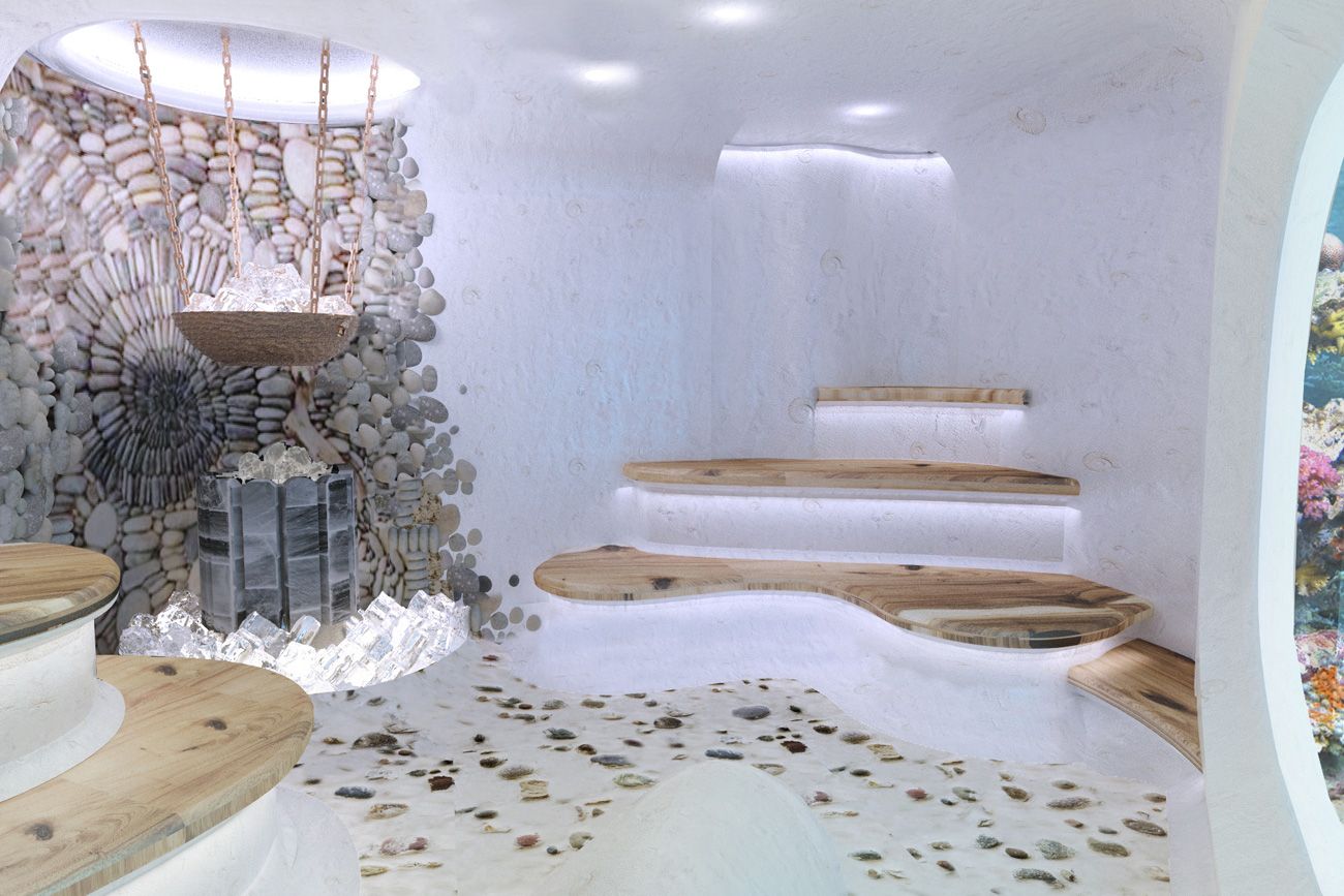 Вьетнамская красная сауна выполнена в виде старинного храма, стены которого выложены из каменных барельефов, а вход венчают тотемные колонны-статуи. Сауна имеет уникальный микроклимат и систему цветотерапии. Солевая сауна оформлена в виде бунгало с соломенной крышей. В одну из стен интегрирован большой аквариум, который просматривается с двух сторон. Сауна образована плавными бионическими формами, в отделке используется ракушечник, галька.