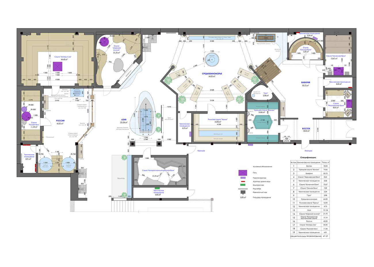 Проект «Бани народов мира» включает 9 уникальных саун и 8 оздоровительных программ, сконцентрированных по зонам. Каждая зона выбрана в соответствии с тематикой происхождения бань и их географией — это Бавария, Россия, Восток, Средиземноморье и Азия.