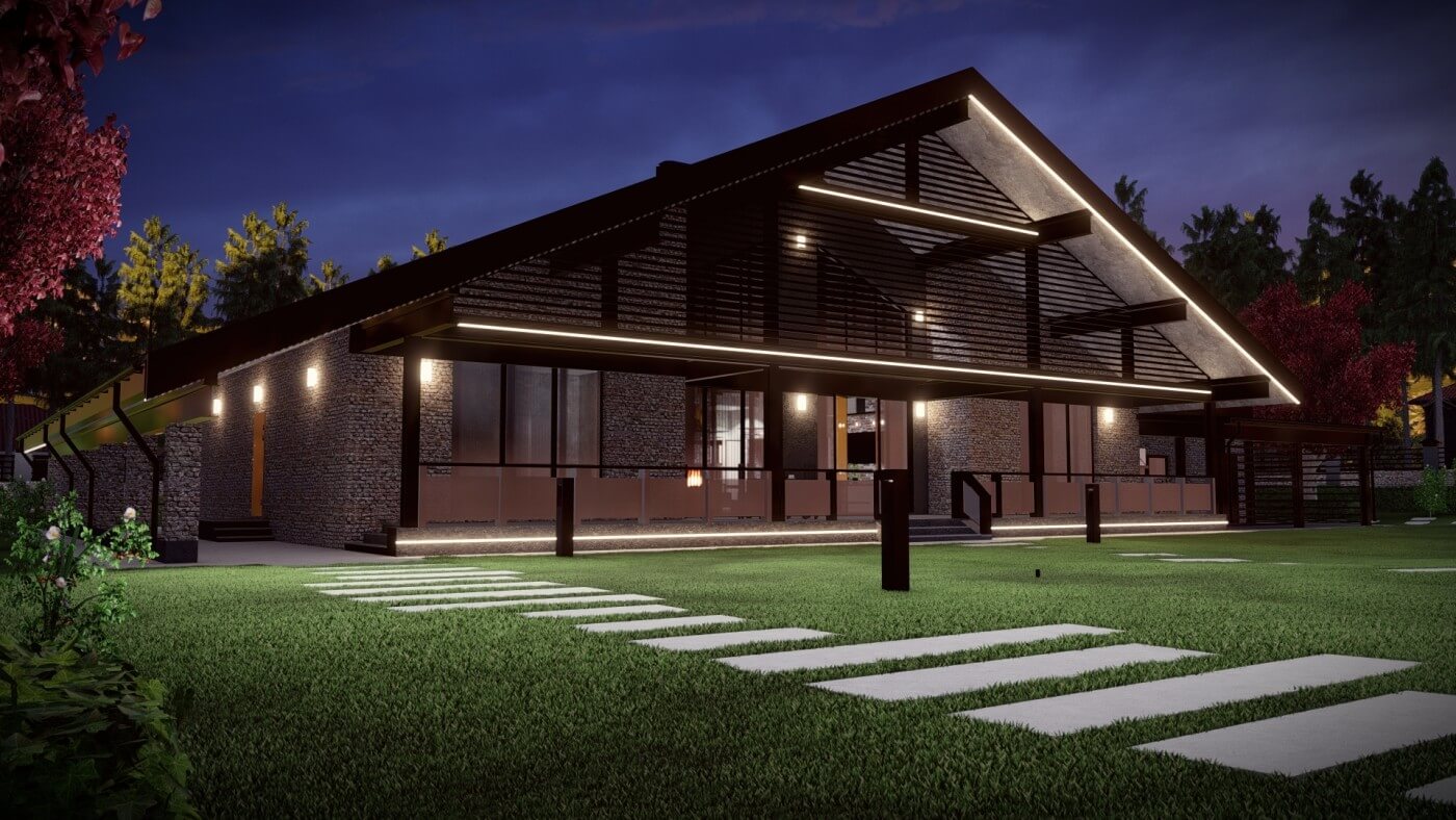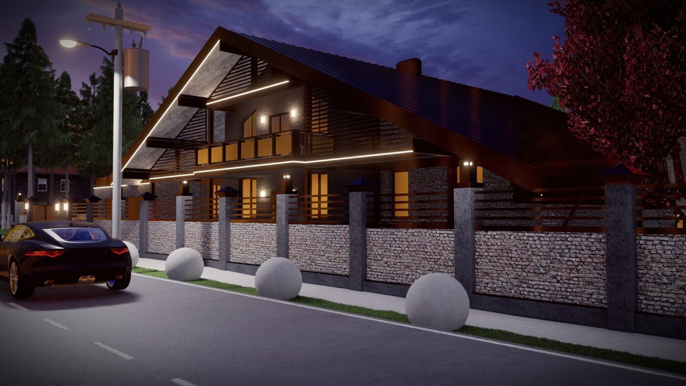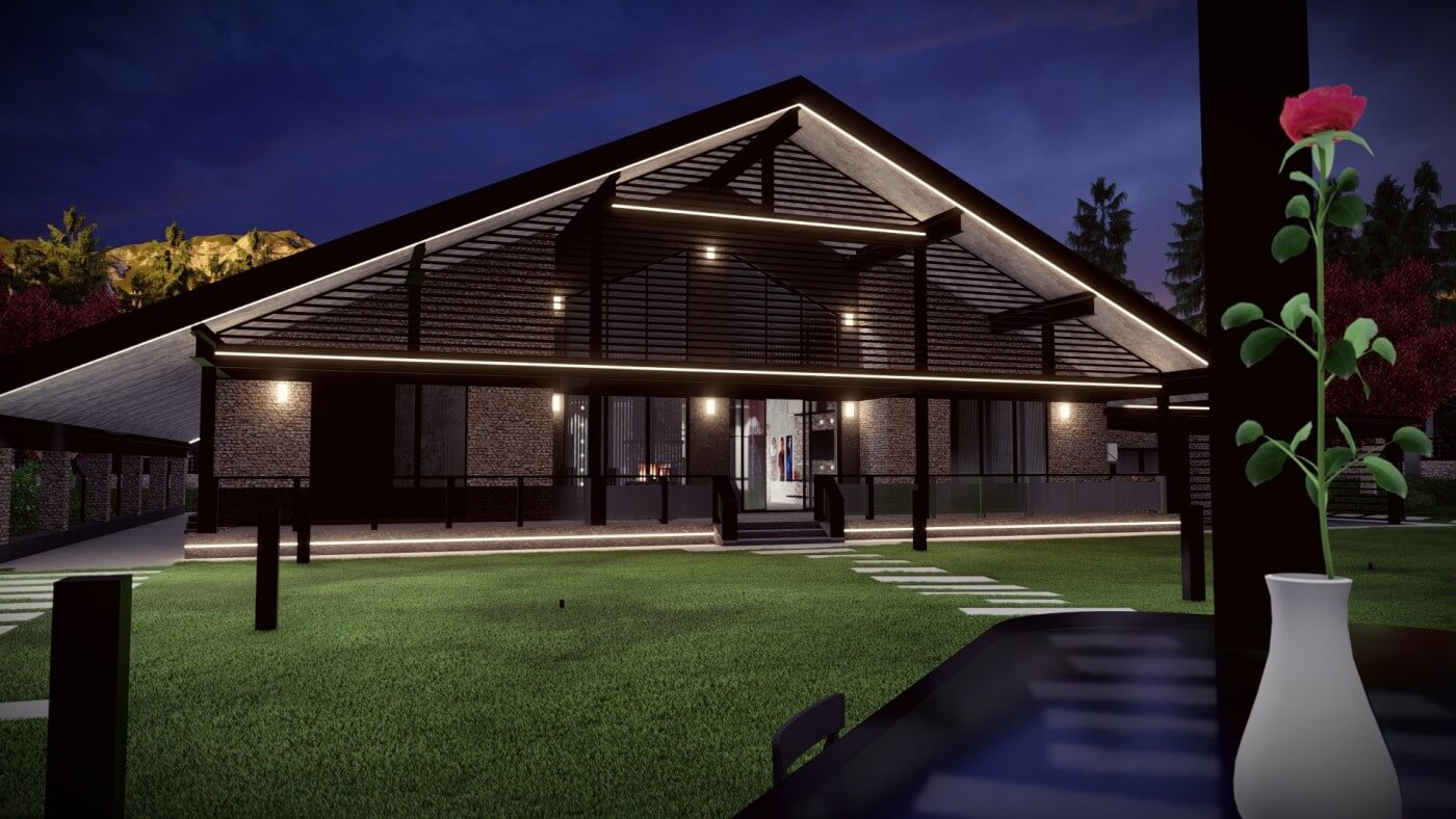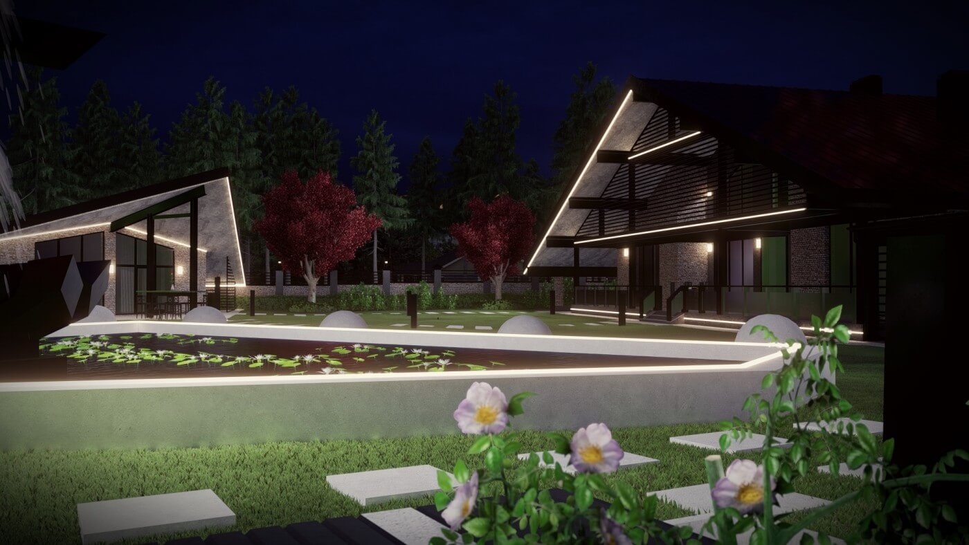 Неплохим дополнением экстерьера дома является архитектурная подсветка в вечернее и ночное время. Она регулируется настроением хозяев коттеджа и может быть либо бело-лунная, либо ярко-красная. Первый сценарий — для создания вокруг дома атмосферы добра и тепла, второй же заставит очевидца оробеть и покинуть это место как можно скорее. Впрочем, вы можете убедиться в этом сами, посмотрев видеопрезентацию проекта на нашем YouTube-канале: https://youtu.be/iIEVSBYqDAM.