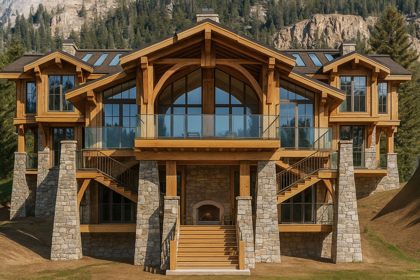 Данный объект представляет собой жилой дом усадебного типа, выполненный в стиле альпийского шале. Архитектурная композиция формируется на основе массивного деревянного каркаса в сочетании с облицовкой натуральным камнем и панорамным остеклением. Структура фасада акцентирована выступающими конструктивными элементами балочных связей и арками, обеспечивающими не только прочность, но и выразительность объёма.