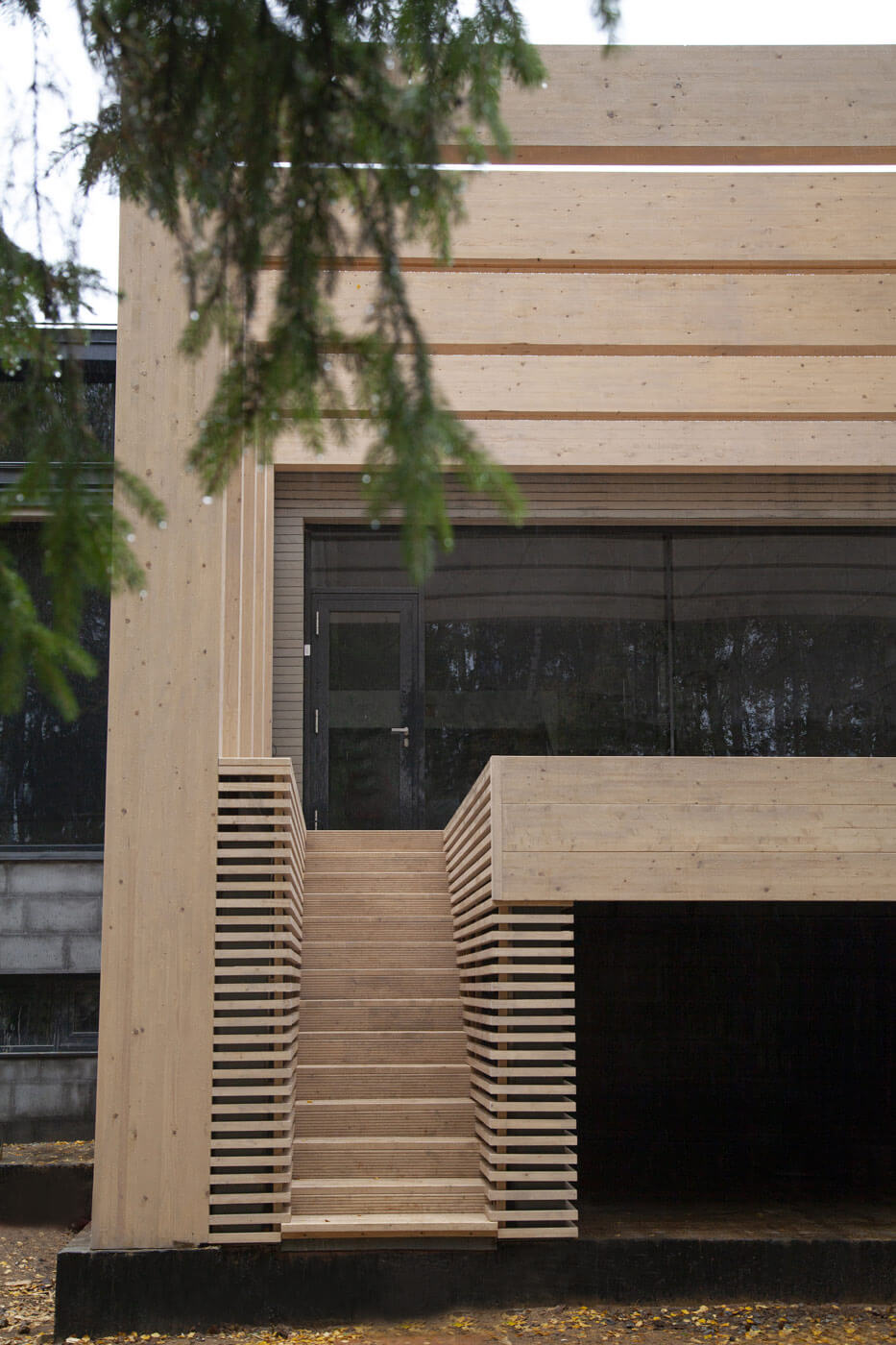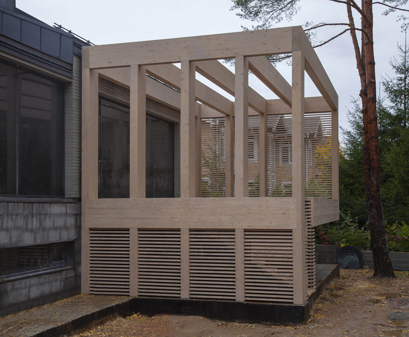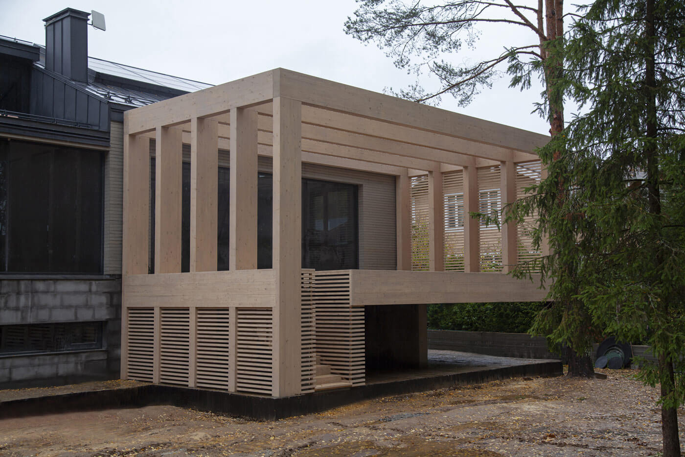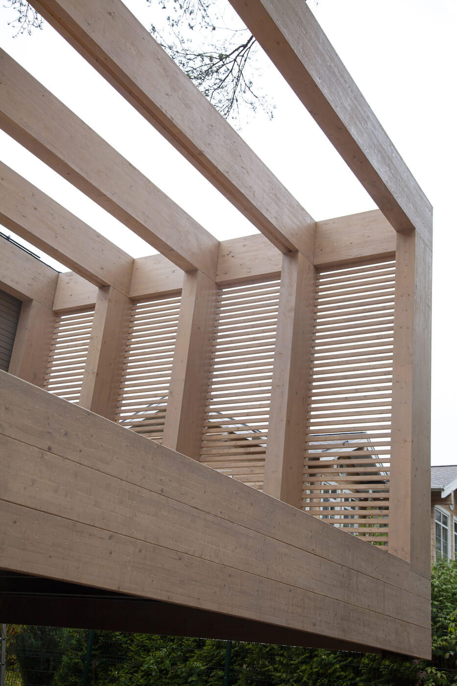 По итогам обмеров построенного дома, учитывая существующие оконные проемы в цокольном этаже и другие точки привязок, сложился уточненный габарит террасы 5,4 м х 10,2 м. Было запроектировано разделы КЖ (фундамент с несущим остовом-пилоном), КМ (платформа с опорным каркасом из металлопроката), АР (архитектурные решения) где тщательно прорабатывались общие решения по террасе, на основании которых мы заказали на заводе – изготовителе деревянные клееные конструкции сечением 560 х 200 мм. Изначально было задумано собирать террасу на скрытом крепеже. Используя современные крепежные системы и конечно же опыт и золотые руки монтажников, сборка прошла на 5 с плюсом!