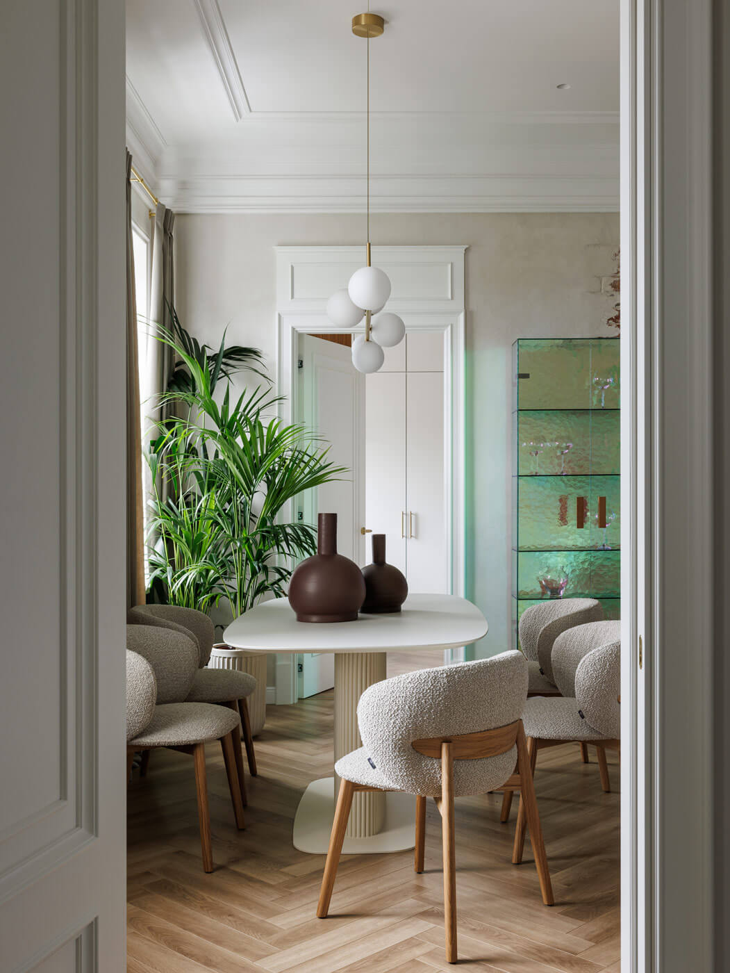 Мы сохранили высоту потолков, добавили точечное освещение, обновили полы керамогранитом, имитирующим рисунок паркета. Гостиную обрамили лепниной, установили электрокамин с увлажнителем воздуха. Специально дизайн-бюро спроектировало дизайнерскую мебель, в том числе, витрины из дихроичного стекла. В зависимости от времени суток их поверхности меняют свой цвет, создавая новое настроение в определённый момент времени. Помимо мягкой и столовой мебели, светильников и текстиля гостиная украшена декором и предметами современного искусства — картинами заслуженных художников России.