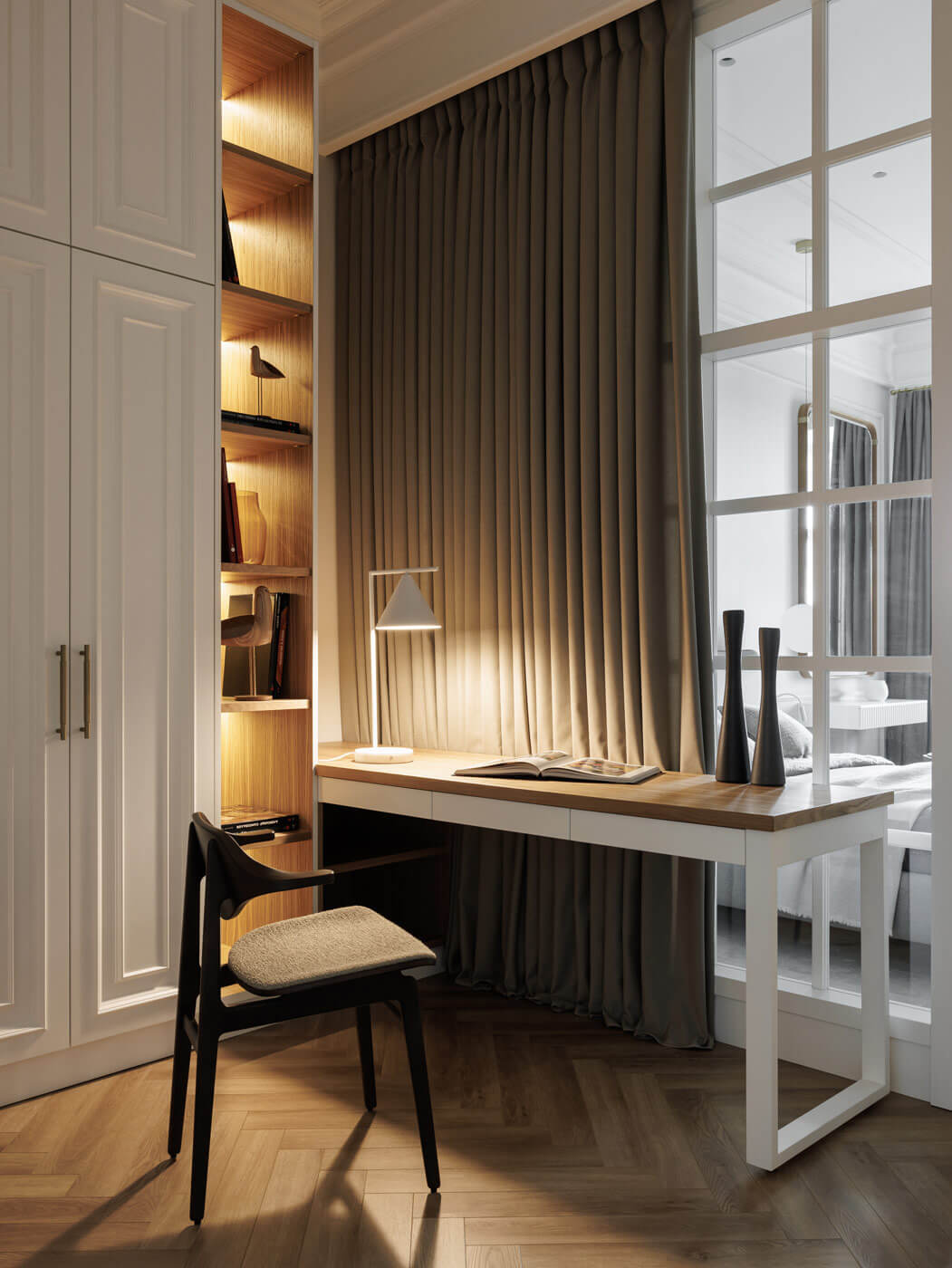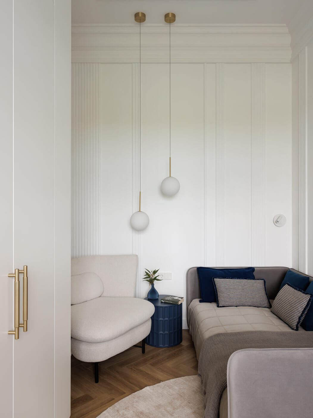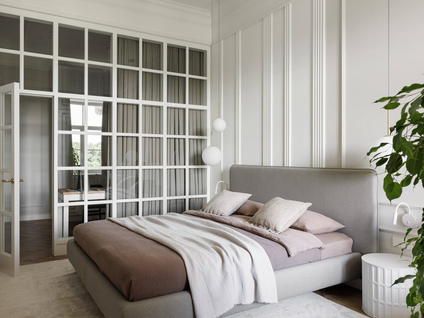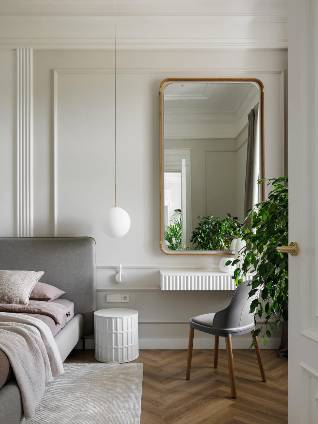 Мастер-спальня также выполнена в светлых тонах. Вертикально расположены молдинги на стенах. Благодаря дизайнерским светильникам в форме шаров комната, буквально, парит в облаках. Зеркало, обрамлённое деревом и туалетный столик добавляют изысканности. Из спальни хозяева легко могут попасть в кабинет-гардеробную, который отделен стеклянной перегородкой. Корпусная мебель из массива, стеллажи с подсветкой создают здесь камерное пространство.