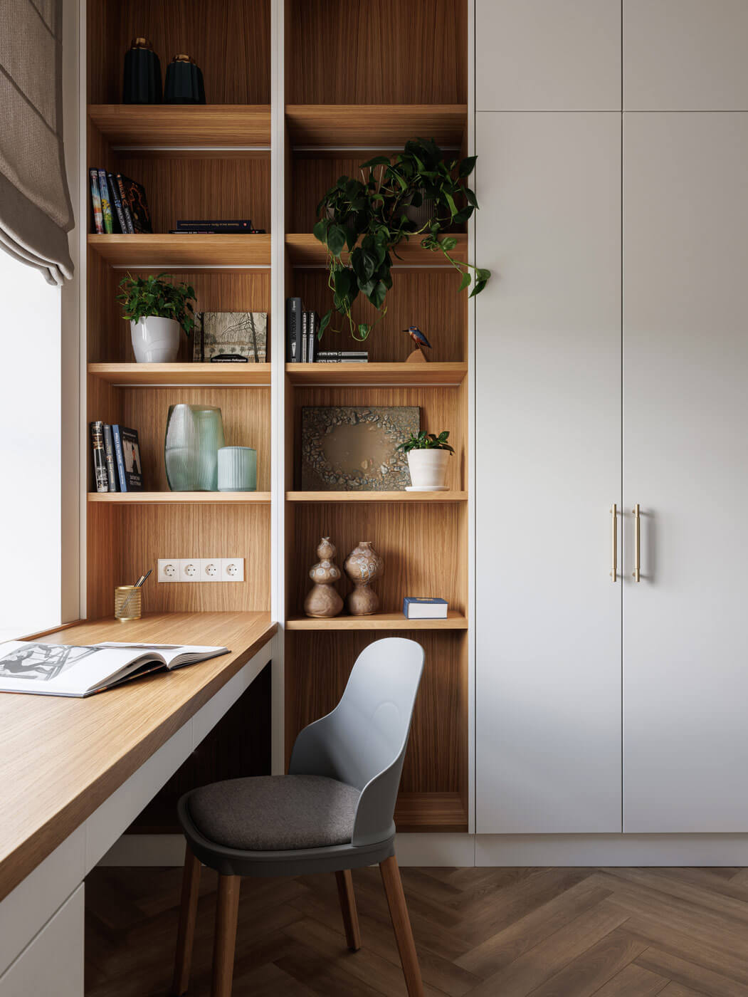 Детская комната также выполнена в минимализме. Рабочее пространство размещено у окна. Широкий подоконник служит продолжением письменного стола. Максимально использовать пространство позволила эргономичная мебель.