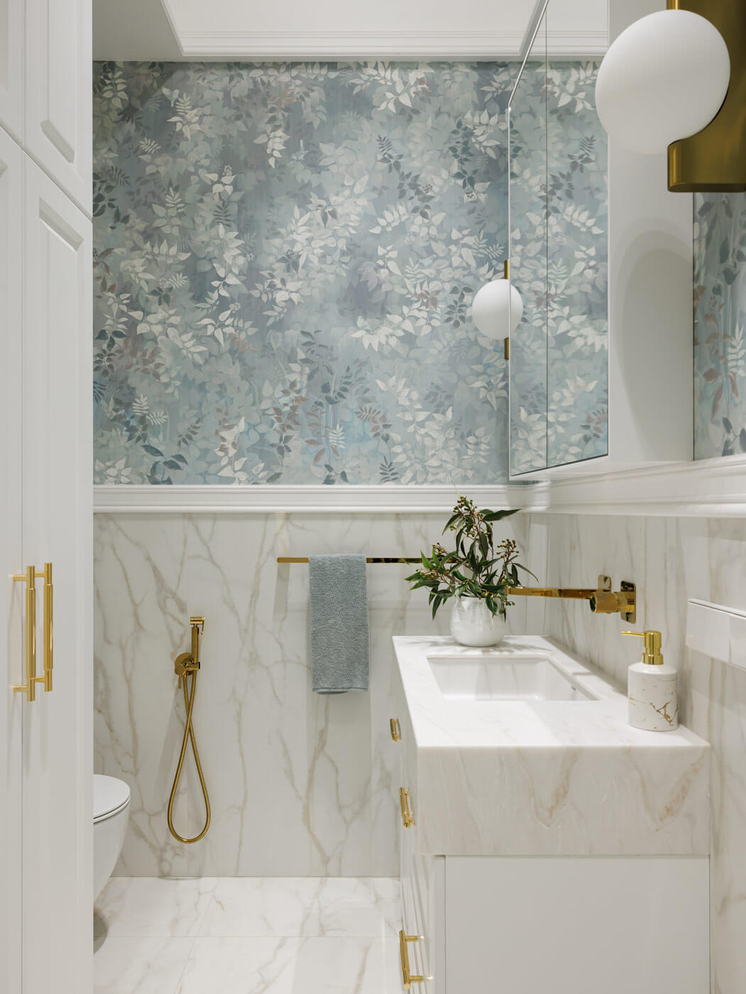 В ванной комнате использовано несколько видов плитки, оригинальная фреска и сантехника в золотой отделке.