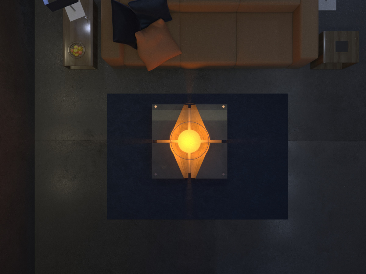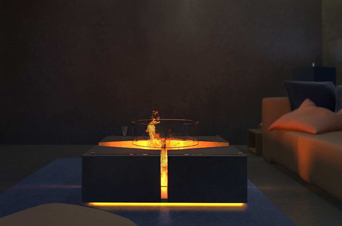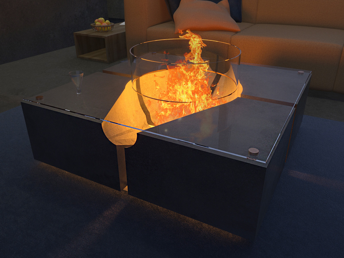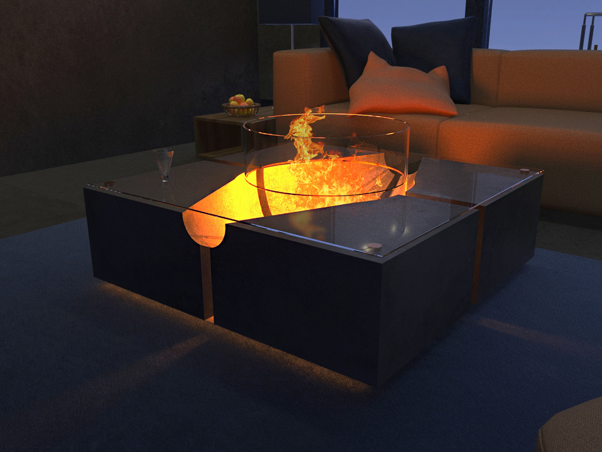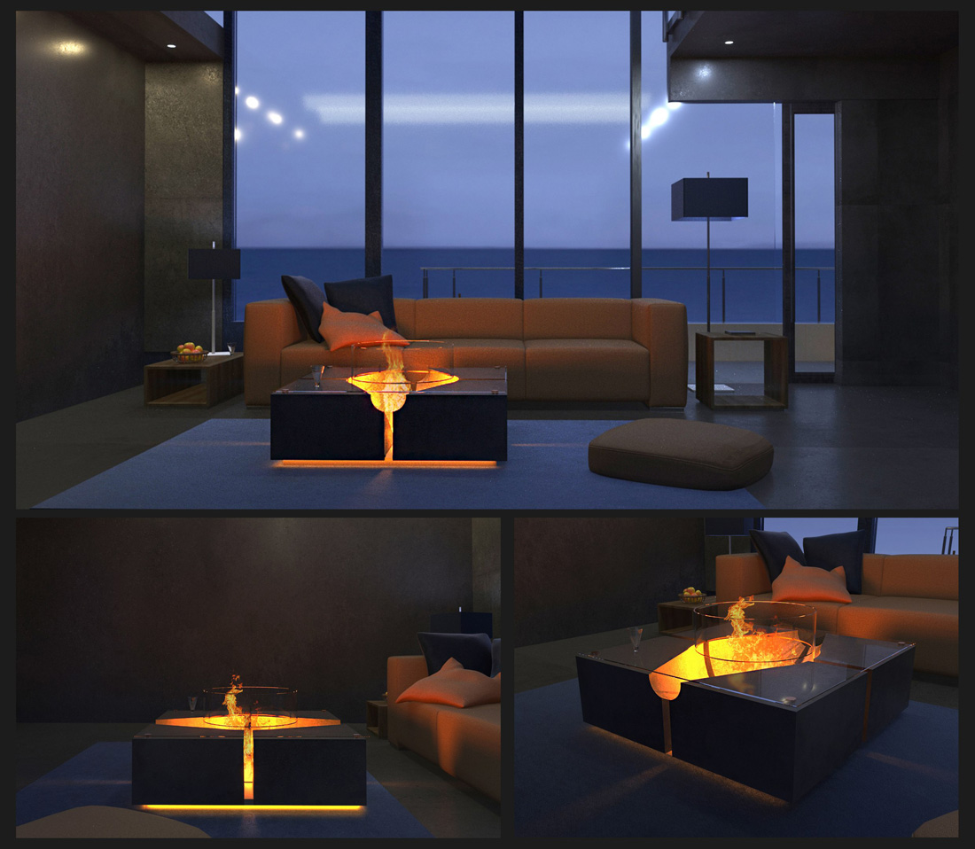 Идея создания проекта - показать эффект преобразования метала. Сам столик напоминает застывший монолитный блок руды. Но при разжигании камина этот блок как бы изнутри начинает плавится и вытекать, создавая эффект плавления.