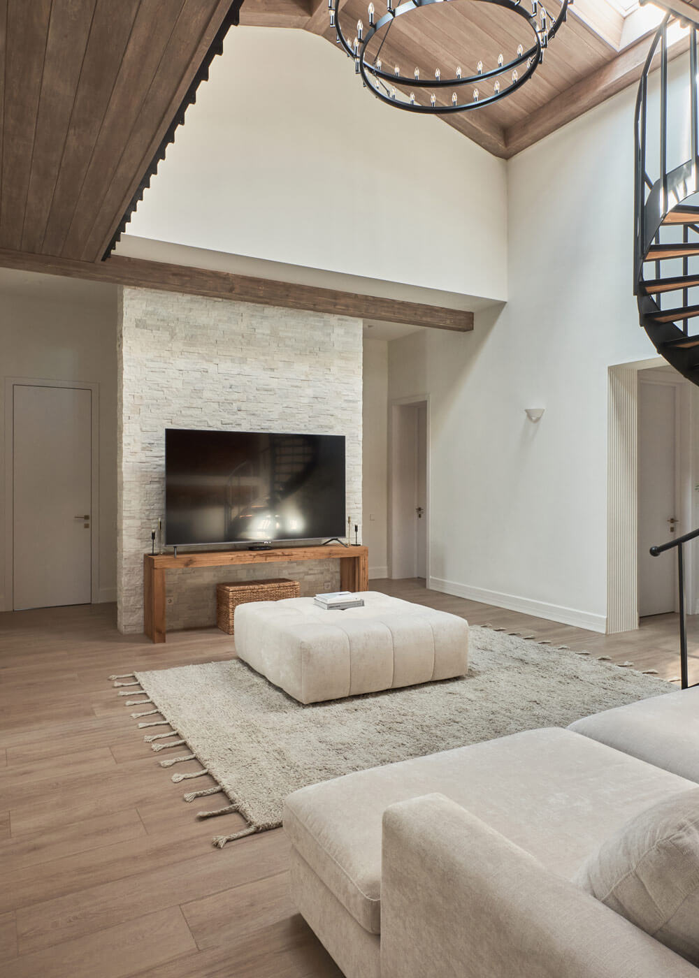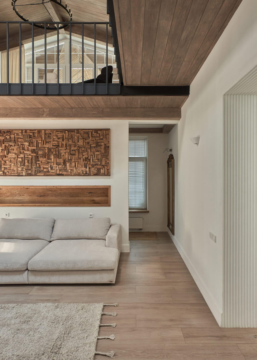 Проект представляет собой гармоничный синтез архитектурной целостности и интерьерных решений, основанных на принципах вневременного дизайна. Центром композиции выступает двухуровневая гостиная с каскадным естественным освещением, достигнутым благодаря панорамным окнам и остекленным потолочным проемам. Архитектурными доминантами пространства стали металлическая винтовая лестница с выразительным силуэтом и открытый балкон, ведущий в обсерваторию.