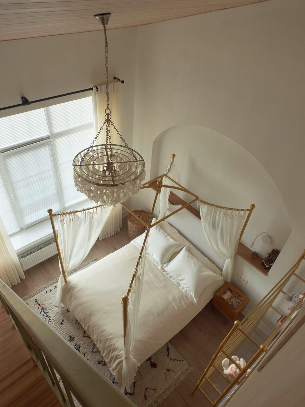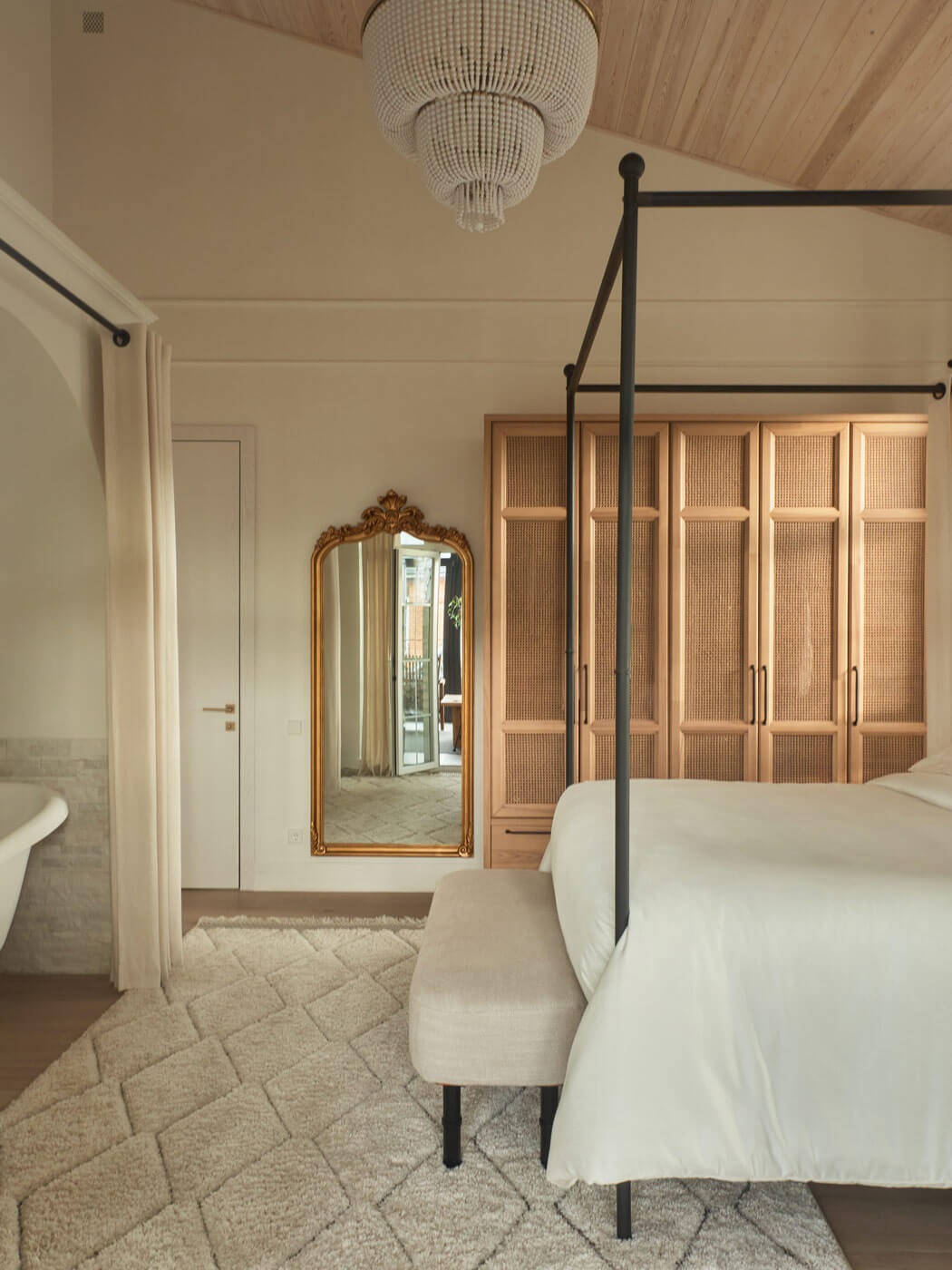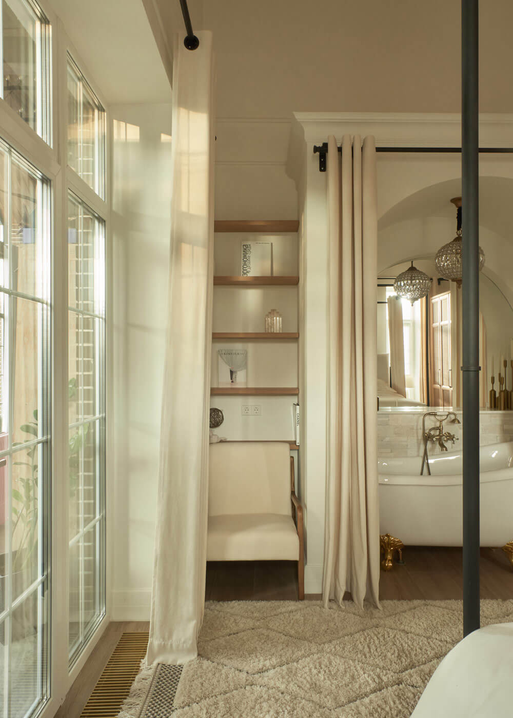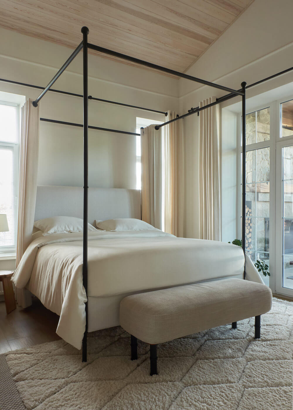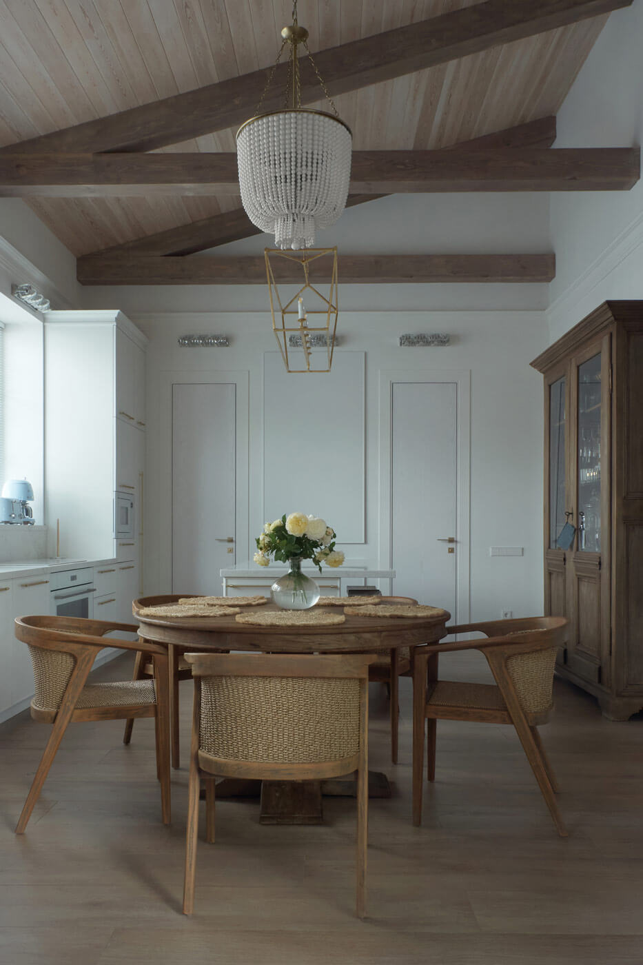 Кухонное пространство организовано вокруг острова с интегрированной обеденной группой, а мастер-спальня включает архитектурный акцент — классическую ванну, размещённую в арочной нише с драпировками. Проект решён в сдержанной натуральной палитре, где сочетание металла, стекла и природных текстур создаёт атмосферу минималистичного шале с элементами эко.